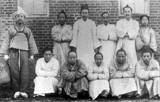 왼쪽 중죄수 복장이 이승만, 앞줄 오른쪽 부터 김정식, 이상재, 유성준, 홍재기, 강원달