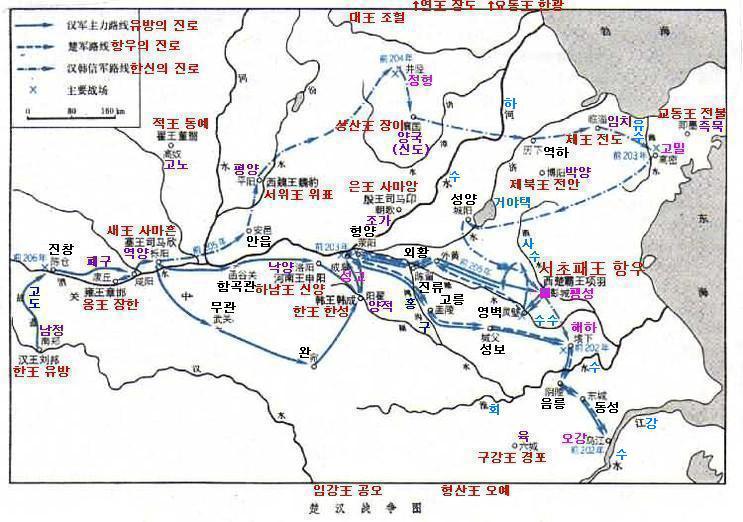 이후 유방은 위왕(魏王) 표(豹), 은왕(殷王) 사마앙(司馬卬) 등을 격파하며 순조롭게 진격을 거듭했다. 당시 항우는 북쪽에서 제나라와 싸우고 있었고, 유방은 다섯 제후를 끌어모아 무려 56만이라는 대군으로 항우의 본거지인 팽성(彭城)에 진입했다. 이때, 제나라에서 싸움이 끝나지 않았던 항우는 3만여 명의 병력을 이끌고 급히 달려와 한군을 그야말로 개박살냈다. 한군은 곡수(穀水)와 사수(泗水)에서 10만이 죽고 수수(睢水)에서 또 10만, 도합 30만 이상이 죽었다. 그야말로 처참할 정도의 패전을 당한 것.