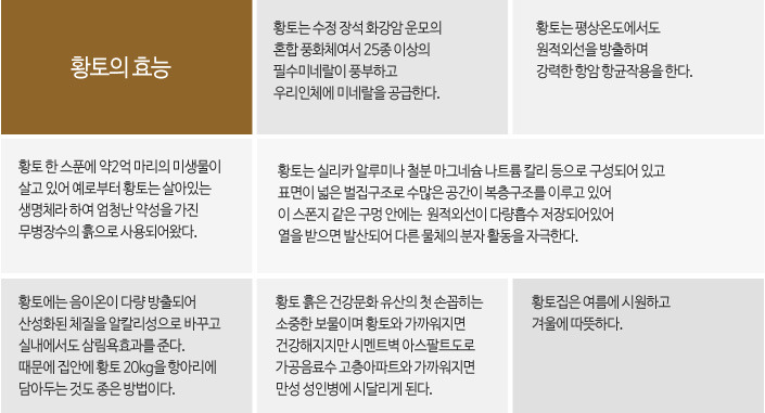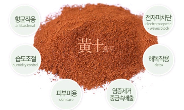 황토의 가장 근본적인 효능은 황토에서 파장되는 원적외선이다. 원적외선은 세포의 생리작용을 활발히 하고, 열에너지를 발생시켜 유해 물질을 방출하는 광전 효과가 있어 정화력, 분해력이 있는 황토는 인체의 독을 제거해주어 제독제, 해독제로도 사용되고 있다. 황토에서 유익한 원적외선이 복사되어 인체에 흡수됨으로써 신진대사가 원활히 이루어짐으로 노화방지, 신진대사 촉진, 만성피로 방지, 각종 성인병 예방, 화상에 효과는 물론 적조 현상을 막는 효과도 있다. 무엇보다도 물질을 활성화시키는데 가장 효력이 있는 생명선으로 불리는 원적외선과 열에너지를 발생시켜 체내에 유해물질을 방출시키며 사계절 쾌적한 온도를 유지하고 여름철의 습기를 흡수했다가 건조한 계절에 뿜어주고, 흙 미립자 틈 속으로 바람이 통해서 환풍기 구실도 한다.