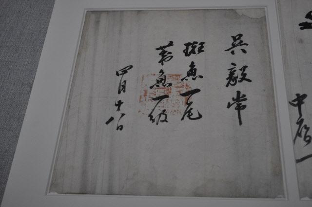 정조가 장용영 군관 오의상에게 조기 한 마리와 웅어 한 두름을 상으로 내린다는 기록. 출처=수원 화성박물관 |