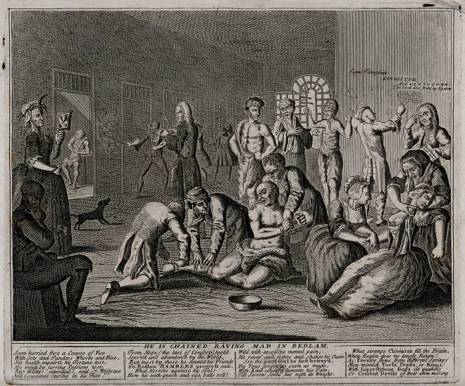 유럽에서 가장 오래된 정신병원은 베들렘Bethlem이다. 13세기에 베들렘Bethlehem의 작은 성모 수도원이라는 이름으로 세워진 곳인데, 1403년 귀화인을 수용하면서 6명의 광인도 함께 입소하게 되었다. 시간이 지나면서 결국 수용인 대부분이 광인으로 바뀌고, 이름도 와전되면서 "대혼란, 미친 곳bedlam"이라는 별칭을 얻게 되었다. 위 그림은 윌리엄 호가스의 1733년 작 8부작 <레이크의 인생변천>의 마지막 그림이다. 머릿니 예방을 위해 삭발을 당한 채 쇠고랑으로 바닥에 묶여 있다. 이런 그림을 통해 베들렘의 무시무시한 이미지가 각인되었다.
