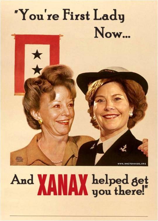 가운데: 자낙스 광고 포스터. 1981년 업존 사에서 개발해 판매한 자낙스는 "공황장애"에 특효를 가진 약으로 자리매김하였다. 자낙스는 1990년대 초 정신의학계에서 가장 인기 있는 약이 되었으며, 정신의학계 내부에서는 공황장애를 "업존 병"으로 부르기도 했다.