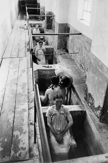 정신의학은 수용소와 함께 대중으로부터 혐오의 대상이 되어 갔다 .1세대 생물정신의학의 유산인 유전적 숙명을 뜻하는 광기의 오명을 피하기 위해. 정신의학은 '신경성'이라는 용어를 만들어 냈다. 수용소에 들어가지 않으려는 환자와 대중의 혐오를 피하고 부자 환자를 유치하려는 의사가 공모해 '신경성'이라는 단어를 만들어 낸 것이다. 신경성 환자를 유치하기 위한 온갖 치료법이 난문하던 이 시기 드디어 심리적 치료의 싹이 텄다. 그러나 여전히 물리치료가 개발되기 전까지는 안절부절못하는 환자를 달랠 수 있는 방법은 수치료법을 포함해서 몇 종류 되지 않았다. 1920년 화이트필드에 있던 미시시피 주립병원의 수치료 모습이다.