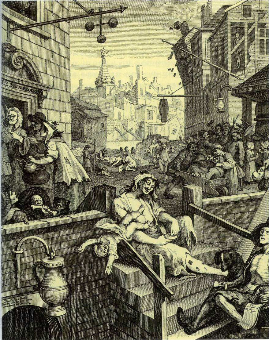 광인과 광기에 대한 전형적인 묘사는 이런 그림이다. 영국에서 알코올중독이 넘쳐나는 현상을 값싼 술인 진에 절은 거리로 묘사했다. 아이들은 방기되고 온갖 범죄와 타락이 그려져 있다. 윌리엄 호가스, <진 거리>, 1750