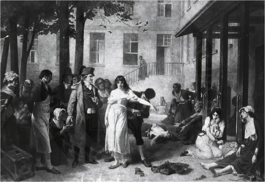 1793년, 프랑스의 자코뱅 정부는 38세의 젊은 의사 필립 피넬에게 비세트르 호스피스의 운영을 맡긴다. 계몽주의와 사회진보철학에 고취된 피넬은 비세트르에서 정신질환의 치유 가능성과 인도주의적 돌봄이라는 개혁주의적 이상을 발휘한다. 필립 피넬의 주장은 명료했다. 수용소 감금은 치료적으로 이용되어야 하며, 수용소의 본질은 심리적 치료를 하는 곳이라는 것이었다. 그는 환자들과 친밀했고, 따듯한 목욕으로 환자를 안정시켰으며, 환자들은 부지런하고 규칙적으로 생활했다. 필립 피넬이 광인을 해방시키는 모습을 상상하여 그린 그림이다.