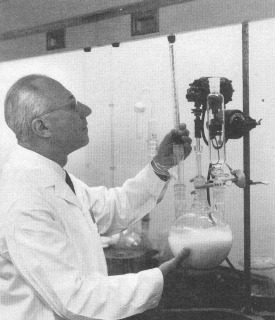 오른쪽: 리오 스턴바크가 1950년대 말 벤조디아제핀 신경안정체를 처음으로 합성하면서, 뉴저지 니틀리에 있는 로쉐 실험실에서 작업하는 모습이다. 바리움은 이 사진이 찍인 다음 해인 1963년부터 판매되었다.