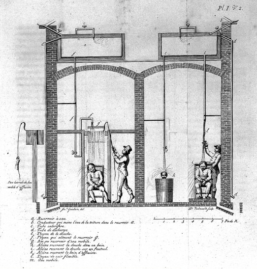 정신의학의 초기 온천에서의 휴식이 치료효과가 있다는 유행이 번졌다. 어느 정도 재산이 있는 중산층은 정신적 이상을 호소하면서 곳곳의 온천으로 휴식 여행을 떠났다. 잉글랜드의 바스, 스위스의 리기-칼트바트, 독일의 비스바덴, 프랑스의 플롱비에르 등이 대표적이었다. 온천에서 정신질환자를 맡던 의사들은 흔히 '온천 의사'라고 불렸다. 사진은 퇴플리츠의 온천에서 환자들이 치료를 받고 있는 모습이다. 쇠뿔을 이용해 부항과 방혈을 하는 고대의 요법을 시행하고 있다. 런던 웰컴 라이브러리