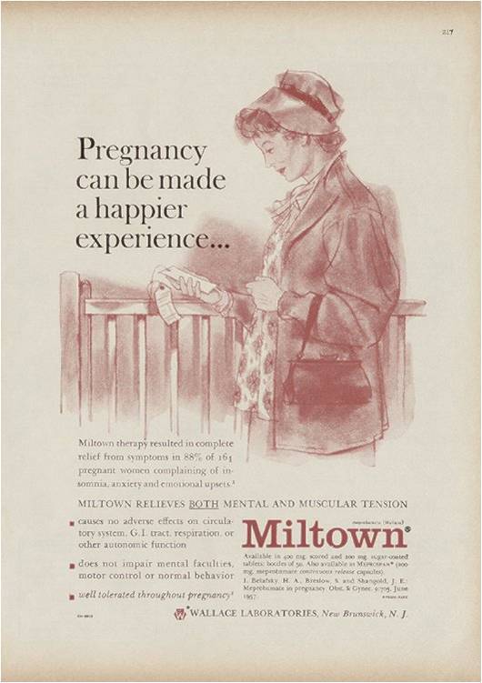 왼쪽: 프랑크 베르거가 개발한 약 "밀타운" 광고 포스터(1959). 이 약은 "행복과 마음의 평화"를 가져다주는 약으로 순식간에 미국을 휩쓸었다.