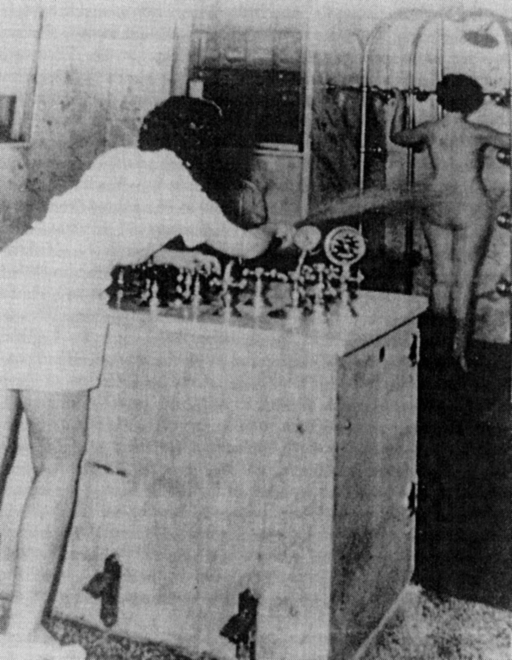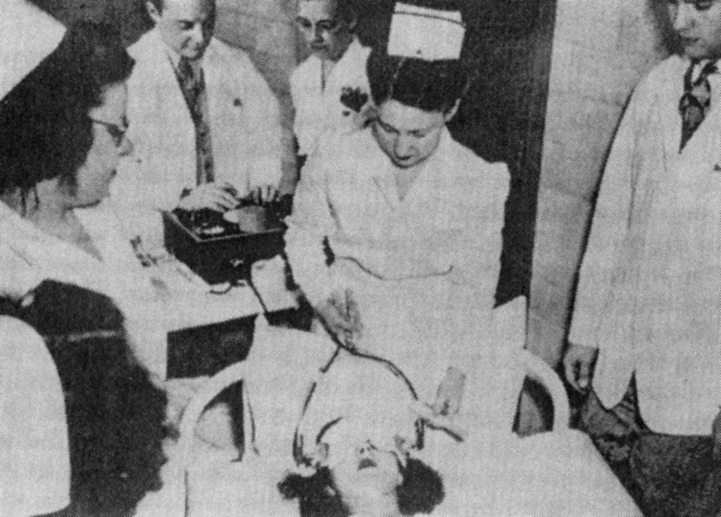 위가운데: 1941년 미국의 정신병원에서 환자를 묶지 않은 채 메트라졸 경련요법을 하는 장면. 라디슬라스 폰 메두나가 1934년에 발명한 메트라졸 요법은 세계 최초의 실질적 경련 요법이다. <미국 정신의학 저널 97(1941)