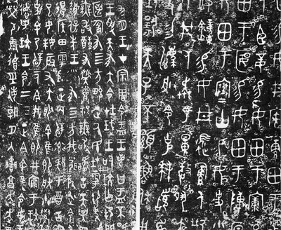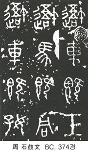 石鼓文(석고문)은 篆書(전서) 中에서 大篆(대전)에 속하며 金文(금문)에서 小篆(소전)으로 변화하는 과정에 있는 대표적인 서체이다.大篆(대전)은 宣王(선왕)때에 太史(태사)인 (주)가 만들었으므로 文(주문)이라고도 한다.석고문은 현존하는 最古(최고)의 石刻文字(석각문자)이다.