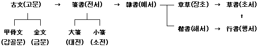 人類(인류)의 歷史(역사)가 변천해 감에 따라 서체도 여러 가지 모습으로 변하여 왔다. 우리는 보통 서체의 종류를 篆(전), 隸(예), 楷(해), 行(행), 草(초) 라는 五體(오체)로 구분하여, 그 서체가 생겨난 시대와 서체의 변천 과정을 말하고 있다.
