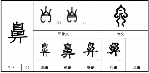 코는 숨을 쉬는 신체기관이다. 숨은 어떻게 쉬는가? '스스로, 저절로' 쉬는 것이다. 하여 '자(自)' 음은 '저절로'의 생략형이다. '저절로, 스스로'의 뜻으로만 유추되어 쓰이게 되자, 새로 '비(畀)' 음을 추가하여 만들었다고 봄이 더 합리적이다.