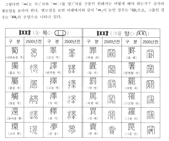 한편, 罪(죄), 買(매), 罵(매), 置(치), 罰(벌) 등에서의 은 '눈 목'자가 아니고 '그물 망'자이니 주의해야 한다.