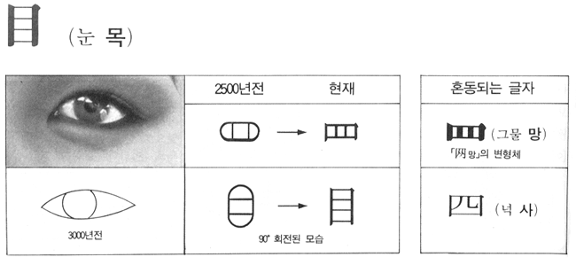 目목자는 눈(eye)의 모습을 완벽하게 다섯 개의 線(선)으로 압축하여 그려 놓은 글자이다. 위 도표에서 보는 바와 같이 目목은 목과 을 90도 회전시킨 目의 두 가지 형태로 사용되어 왔다. 그런데 필자가 조사한 바로는 대다수의 사람들이 目목이 '눈'이라는 것은 알고 있었으나, 이 눈이란 사실은 모르고 있었다. 그 이유를 면밀히 분석해 본 결과 다음과 같은 사실 때문이었다.