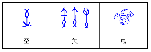허신은 至지를 풀이하면서 "鳥飛從高下至地也. 從一, 一猶地也(새가 날아 아래편 땅 위에 착지하는 모습을 형용하였으며, 구성자 一은 땅을 나타낸다: 필자주)"라 하였는데 아래 갑골문에서 보는 바와 같이 至의 맨 밑선 一을 제외한 부분은 새가 아니라 矢(화살 시)의 자형이기 때문에 '새와 결부된 풀이'는 잘못으로 드러났습니다.