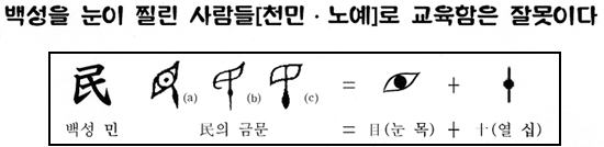 "민심은 천심이다"라는 말에서와 같이 우리 민족은 예로부터 백성을 하늘과 동격으로 보고 왕보다 더 상위의 존재로 인식해 왔다. 그런데 이러한 인식과는 정반대로, 문자 民(백성 민)에 대해, 축약변조된 위 ⒞의 자형을 근거로 "사람의 눈이 창 따위에 찔린 모양으로 사로잡힌 노예 또는 정보소외계층인 천민이다"와 같은 비하적 풀이가 세간에 널리 유포되어 있으니 이는 독재자에게 빌미를 제공하여 망국에 이르게 할 중대한 문제이다. 그러나 위에서 보는 바와 같이 눈을 제외한 나머지 부분(| 가운데 점이 찍힘)은 갑골문 및 금문에선 '창'이 아니라 '十(열 십)'자이기 때문에 이러한 해석은 전제부터 잘못된, 전적으로 오류이다.