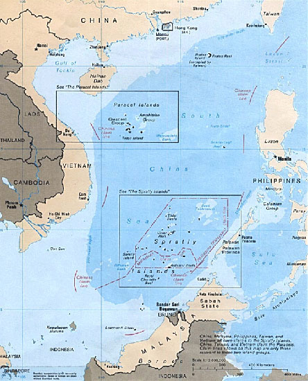 지도상엔 위아래로 두 개의 사각형이 둘러져 있는데 위의 것은 파라셀(Paracel) 군도이고, 아래의 것은 스프라틀리(Spratly) 군도이다. 이들은 흔히 서사군도西沙群島와 남사군도南沙群島로 더 알려져 있으며 현재 국제적으로 영유권 분쟁 상태에 놓여 있다. 그런데 이들 섬의 명칭 또한 팔라완과 마찬가지로 유래가 밝혀지지 않았다.