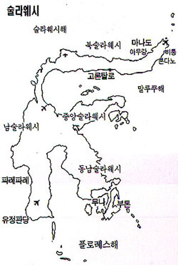 위 술라웨시 섬은 보르네오 섬 동쪽에 위치한 인도네시아 령으로 거의 한반도 면적만큼의 넓이를 가진 큰 섬이다. 포르투갈 식민지 시대에 술라웨시는 셀레베스Celebes로 와전된 까닭에 현재도 셀레베스라 일컬어지기도 하나, 정식 이름은 어디까지나 술라웨시이다. 그런데 술라웨시는 ‘술라’와 ‘웨시’의 합성어이다.