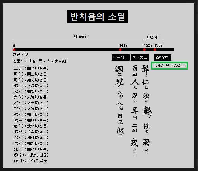 위 표를 보시면 반절음과 동국정운식 한자음 표기를 서로 비교하실 수 있습니다. 보시면 약 1500년 전의 반절음과 동국정운식 반치음(△)이 규칙적으로 일치하다가 단 60년 만에 반치음이 사라져 불일치를 하게 됩니다. 이렇게 1500년의 시차를 넘어 규칙이 일치되다가 반치음(△)이 갑자기 사라진 이유를 설명하실 수 있는 분을 계신지요?