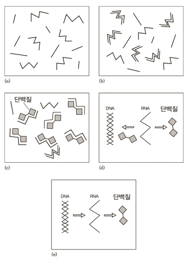 RNA의 세계RNA분자(a)가 자기복제를 한 후(b) 단백질을 합성하기 시작하였으며(c), 단백질이 촉매로 작용하면서(d) DNA가 RNA의 역할을 대신하였다(e).