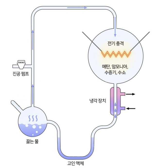 오파린의 가설은 1955년 발표된 미국의 밀러(StanleyMiller)와 유리(HaroldUrey)의 실험 연구에 의하여 강력한 지지를 받게 되었다. 그들은 당시에 원시대기의 주성분으로 알려졌던 메탄, 암모니아, 수증기, 수소의 혼합기체를 밀폐된 실험기구에 넣고, 일주일 동안 전기충격을 가했다. 그 후, 실험기구의 바닥에 고인 액체를 분석하여 아미노산, 지방산, 당류 등 유기물질이 생성되었음을 발표하여 과학계를 놀라게 했다. 하지만, 아미노산은 단순한 유기화합물로 생명체가 아니며, 생명의 기본 구성물질로 중요한 것은 아미노산보다 더 복잡한 유기화합물인 단백질(蛋白質)이다. 이론적으로 아미노산을 농축시키면 단백질이 생성될 수는 있지만, 아직까지 실험실에서 단백질을 합성한 적은 없다.