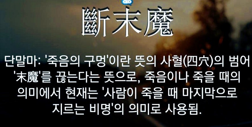"숨이 끊어질 때의 마지막 고통"을 일컫는 단어인 "단말마"는 "끊을 단(斷)"과 급소를 뜻하는 "말마(末摩)"가 결합하여 만들어진 단어입니다.
