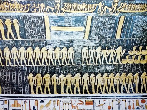 이집트 고분 벽화의 상형문자(히에로글리프)와 상징들. 신과 소통하는 신성한 뜻의 그림이 문자로 발전한 것으로 본다. 신과 여신, 이승과 천상의 모습들을 표현하고 있다.