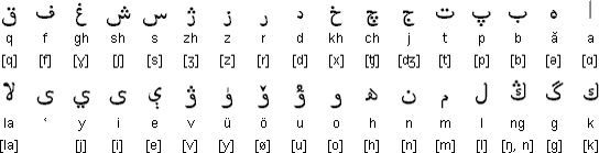 현대 위구르 문자의 간략한 체계이다. 문자를 보면, 단번에 아랍 문자에서 따왔다는 것을 알 수가 있다. 몽골, 만주 문자의 기원이 되었다고 알려진 중세의 위구르 문자와는 완벽하게 달라진 것이다. 중세의 위구르 문자가 생긴 것은 고대 중동에서 나온 아람 문자가 동방으로 전해졌고, 이것이 중앙아시아에서 동서무역에 종사했던 소그드 인들에 의해서 소그드 문자로 변형되어 위구르로 전해졌는데, 이것이 중세 위구르 문자가 되었다.
