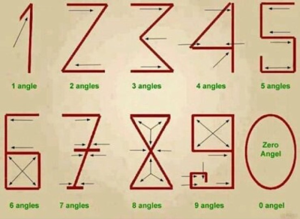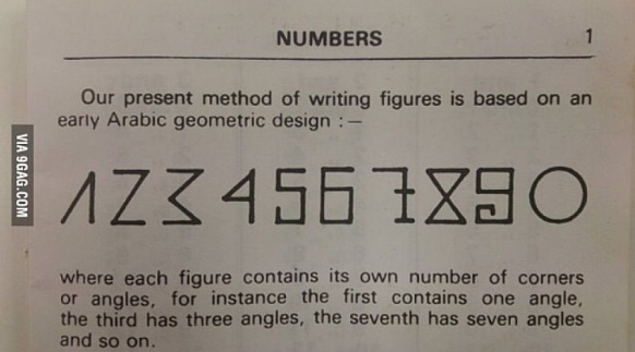 우리의 현재 글자 표기법은 초기 아라비아의 기하학적 디자인에 기초하고 있다. 각각의 그림에는 각도가 포함도어 있다. 예를 들어 숫자 1은 1개의 각을 가지고 있으며, 2는 2개의 각, 3은 3개의 각 등 숫자가 올라감에 따라 각의 숫자도 하나씩 늘어나는 것을 알 수 있다.