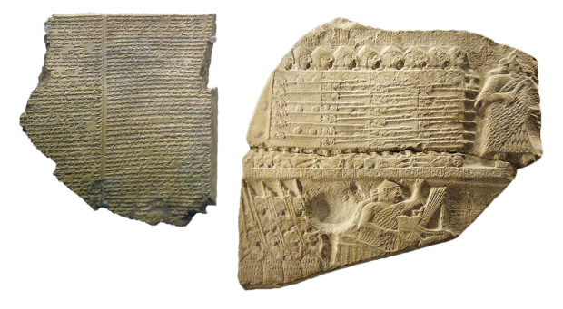 (왼쪽) 길가메시 서사시의 일부가 기록되어 있는 점토판. 대홍수와 방주의 건조에 관한 내용이 들어있다. 기원전 650년경의 것으로 확인된 아시리아의 점토판이 니네베에서 발견되어 현재 영국 런던의 영국박물관에 전시되어 있다. (오른쪽) 에안나툼의 독수리 석비(B.C. 2,450)