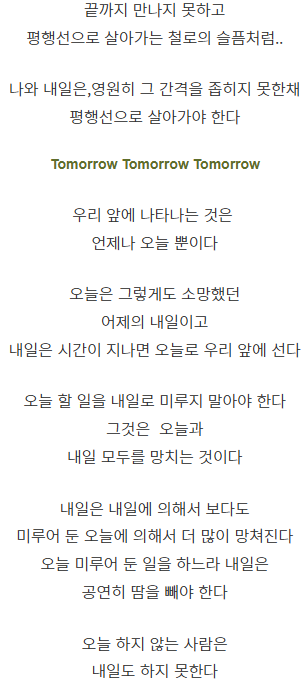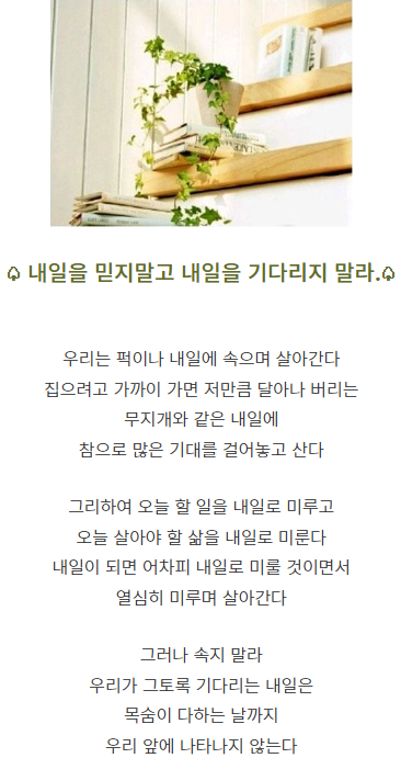 ♠ 내일을 믿지말고 내일을 기다리지 말라 ♠ 작성자오아시스|작성시간26.03.30|조회수5 목록 댓글 0 글자크기 작게가 글자크기 크게가 좋은글 중 오아시스- 옮김해조곡(Am 스케일) 다음검색 현재 게시글 추가 기능 열기 북마크 공유하기 신고 센터로 신고 댓글 댓글 0 댓글쓰기 답글쓰기 댓글 리스트