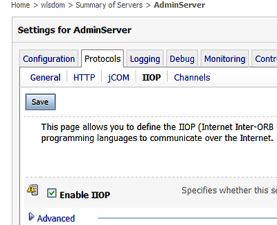 3. Server | Protocols | IIOP 에서 Enabled IIOP 체크 (Default Username 과 Password 도 WLS Admin ID/PW 로 지정)