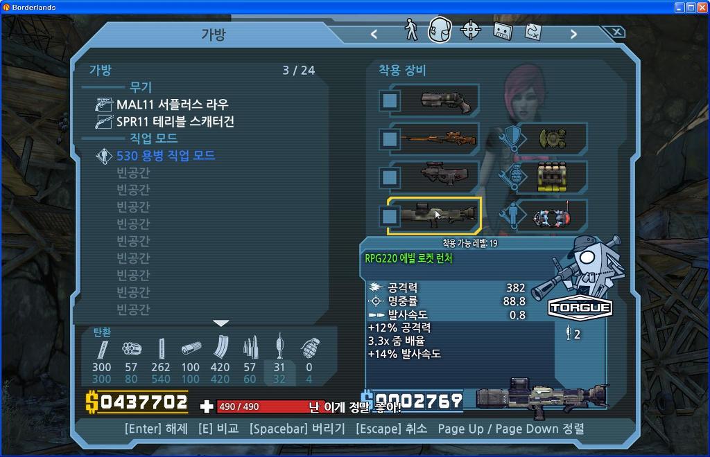 로켓런처입니다. 그리 좋은 옵션의 무기는 아니지만, 잔몹처리에 능하므로 하나쯤 들고다닙니다.