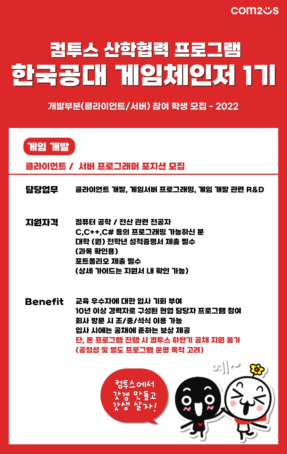 메일 문의(recruit@com2us.com)/ 카카오톡 : '@컴투스채용' 친구 등록 후 1:1 개별상담 및 문의 가능