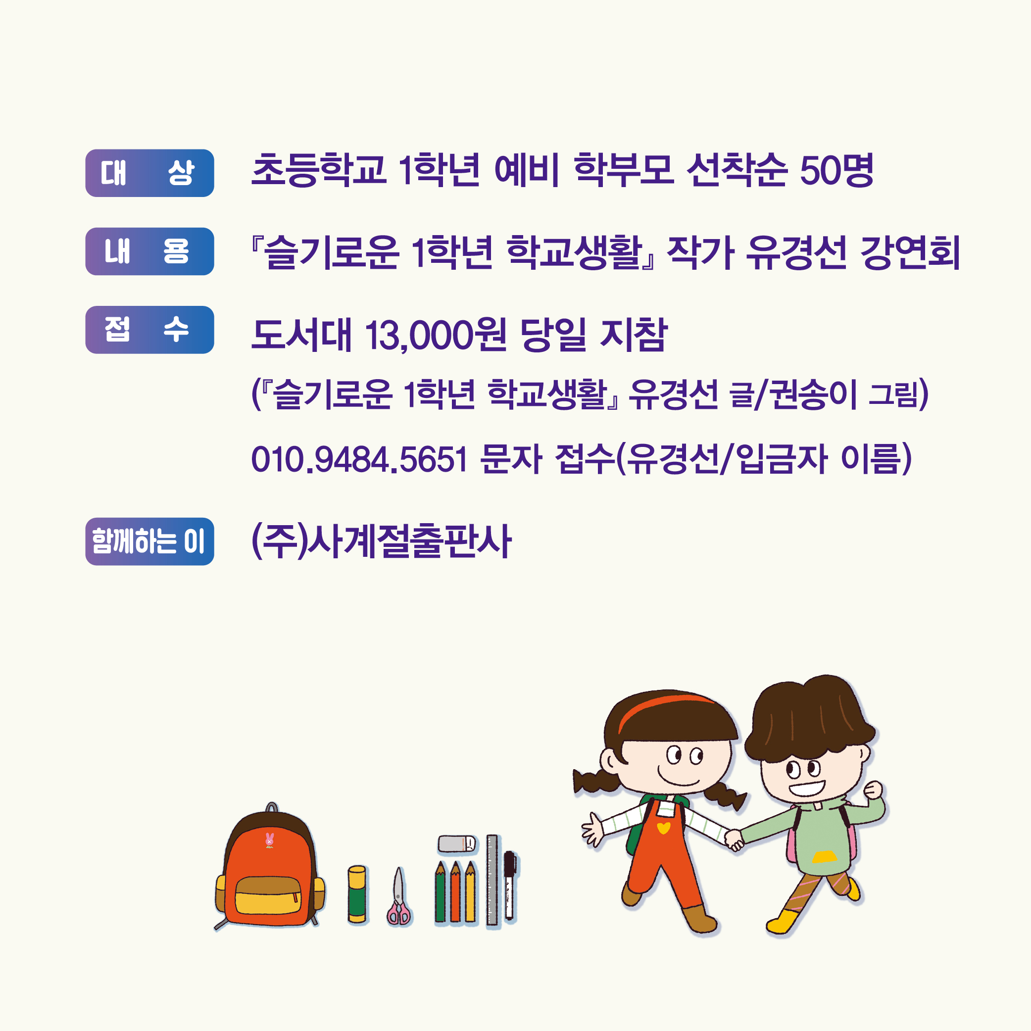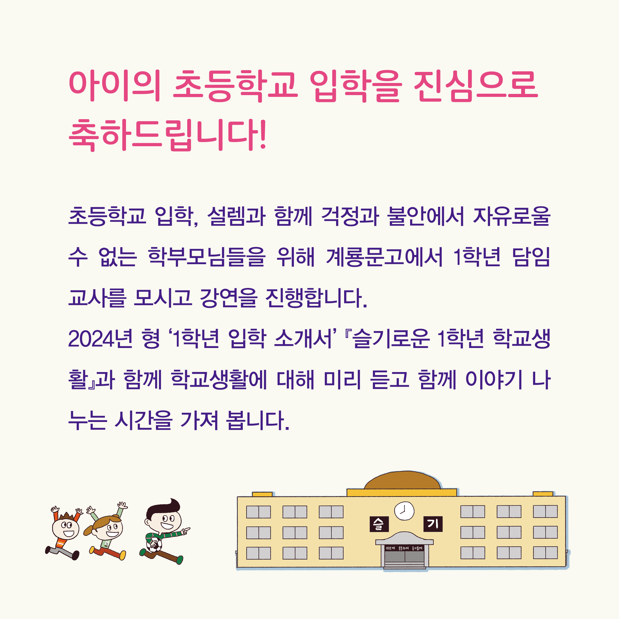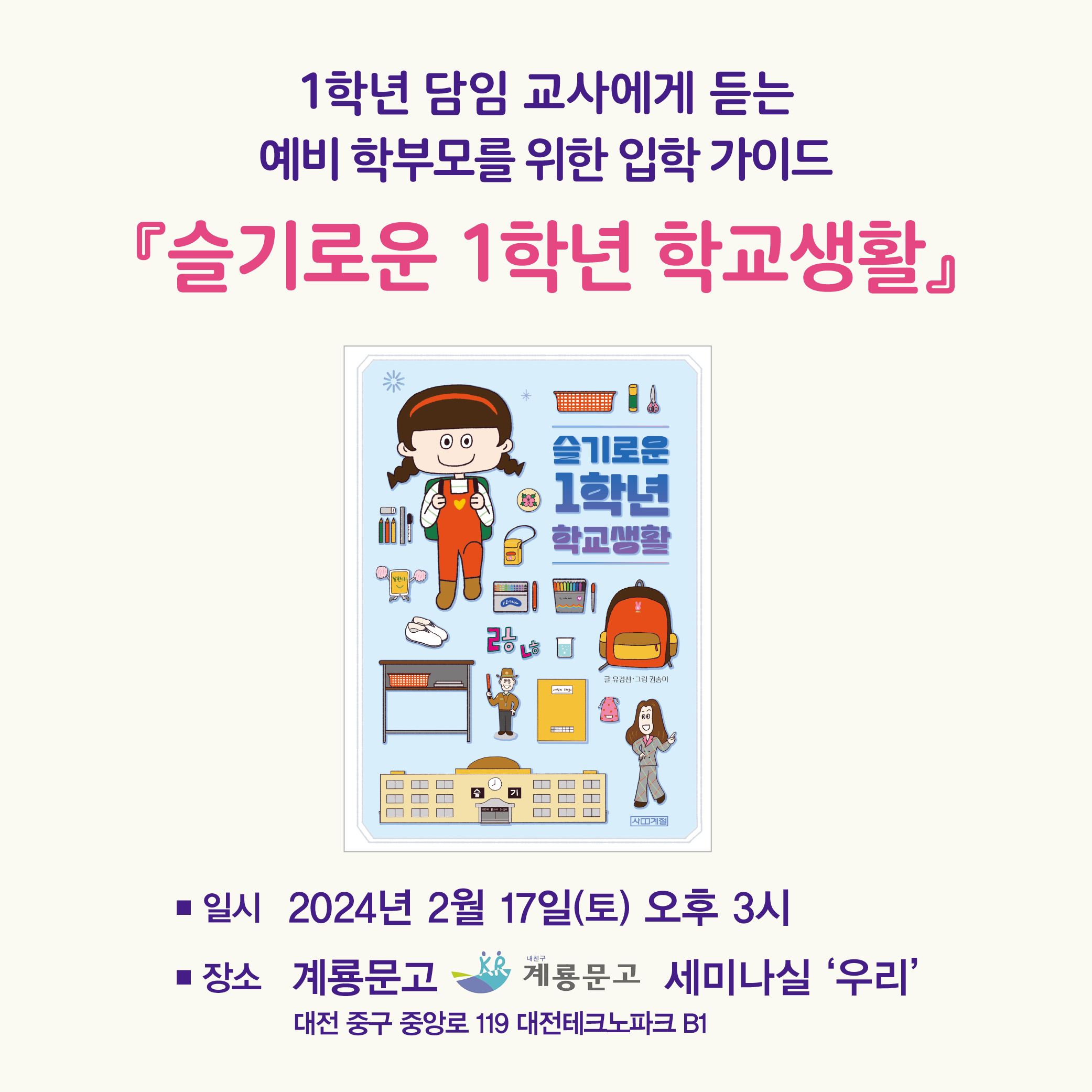 예비학부모를 위한 입학가이드 '슬기로운 1학년 학교 생활' 유경선 강연회 작성자책읽어주는엄마|작성시간24.01.21|조회수86 목록 댓글 0 글자크기 작게가 글자크기 크게가 다음검색 현재 게시글 추가 기능 열기 북마크 공유하기 신고 센터로 신고 댓글 댓글 0 댓글쓰기 답글쓰기 댓글 리스트