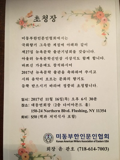1989년 창단이래 미동부한인문인협회는 지난 28년동안 미주한인문학의 발전을 도모하고 한인들의 문화적 정서를 풍요롭게 해주며 뉴욕과 미주사회에 한국문학을 소개하는 역할을 충실히 해왔습니다.