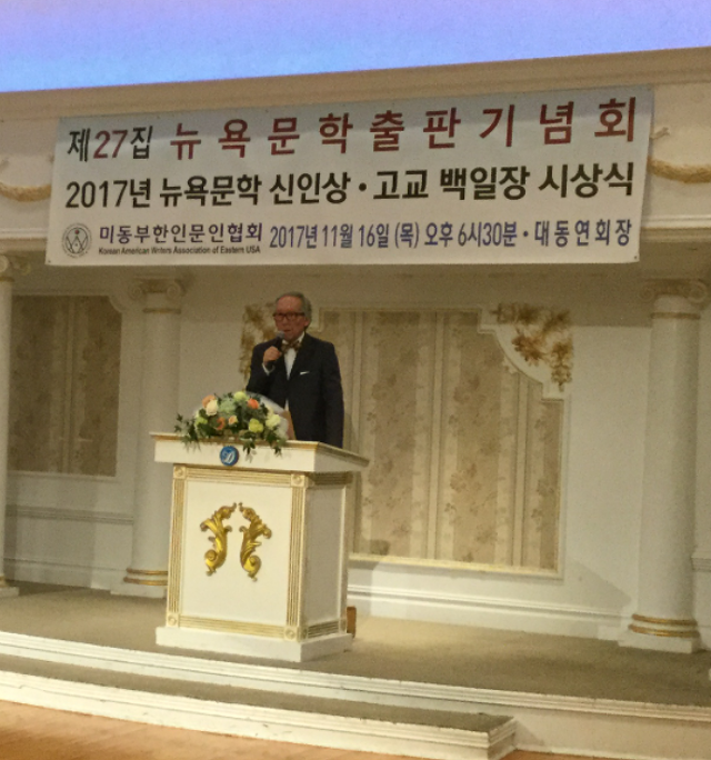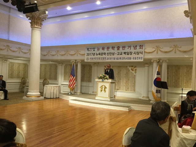 지난 16일 뉴욕 플러싱 대동연회장에서 열린 제27회 '뉴욕문학'출판 기념회에서 축사를 했습니다.