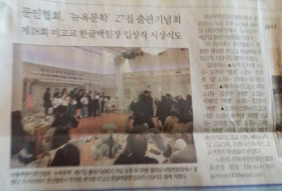 이번 뉴욕문학 27호가 나오기까지 특별히 노심초사하며 동분서주하신 회장님과 편집위원들의 노고에도 격려의 박수를 보냅니다. 그리고 제 27호를 통해 신인상을 수상하신 세분께도 마음으로부터 축하의 꽃다발을 얹어 드립니다.