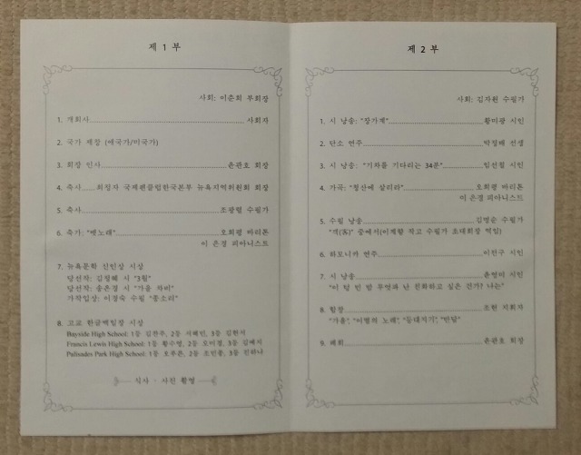 이를위해 그동안 수고를 아끼지 않으신 역대 회장님들과 윤관호 회장님, 임원진여러분 그리고 이민자로서 모국어를 지키며 부단한 열정으로 창작활동을 해오신 협회 모든회원들께 깊은 경의를 표합니다.