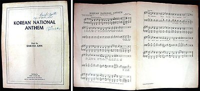 악보 첫 장에는 파란색으로 ‘KOREAN NATIONAL ANTHEM’(애국가)라는 제목과 함께 ‘Music by EAKTAI AHN’,(작곡가 안익태) ‘John Starr KIM Korean Church and Institute 633W. 115th Street, New York 25, N.Y’(발행처 존 스타 김 목사 뉴욕한인교회) 등이 영문으로 표기돼 있다.