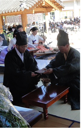 0 축관(祝官)은 초헌관에게 폐백(幣帛)을 건네시오