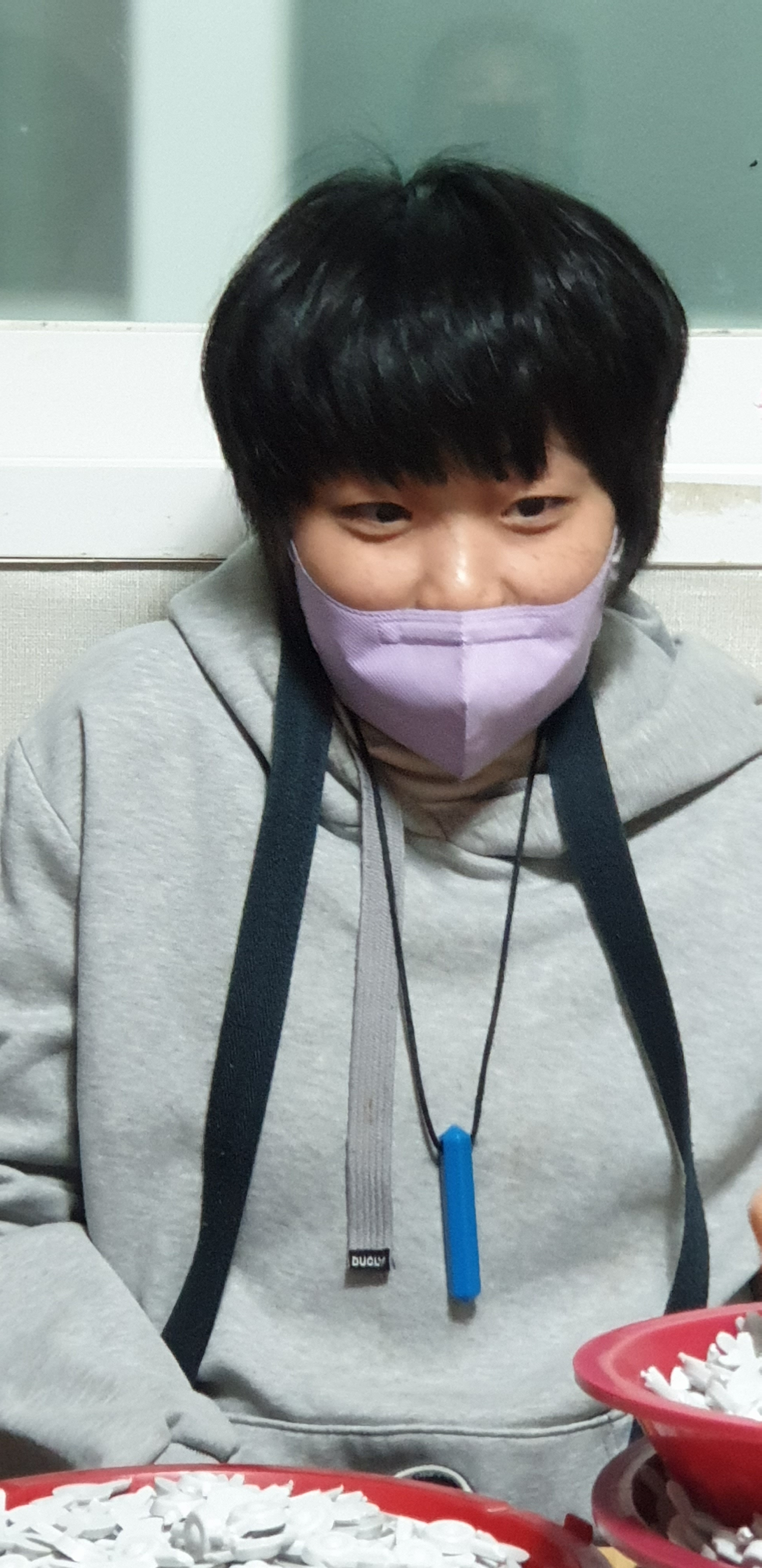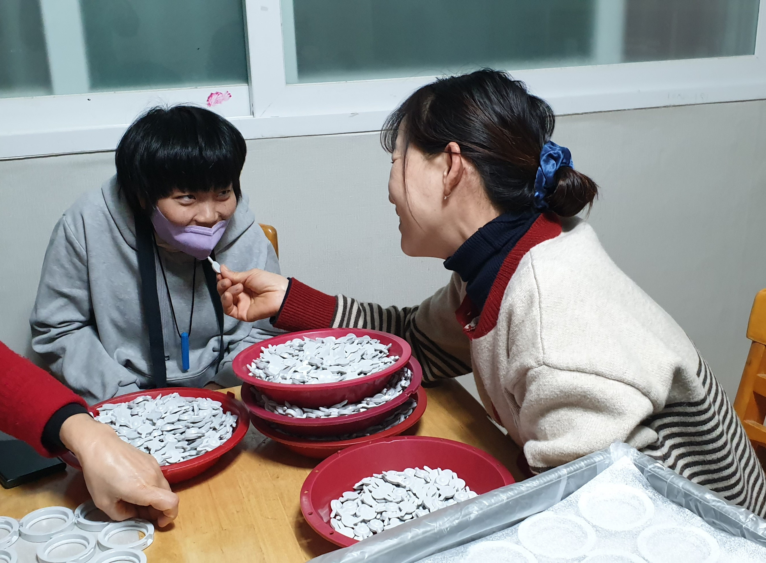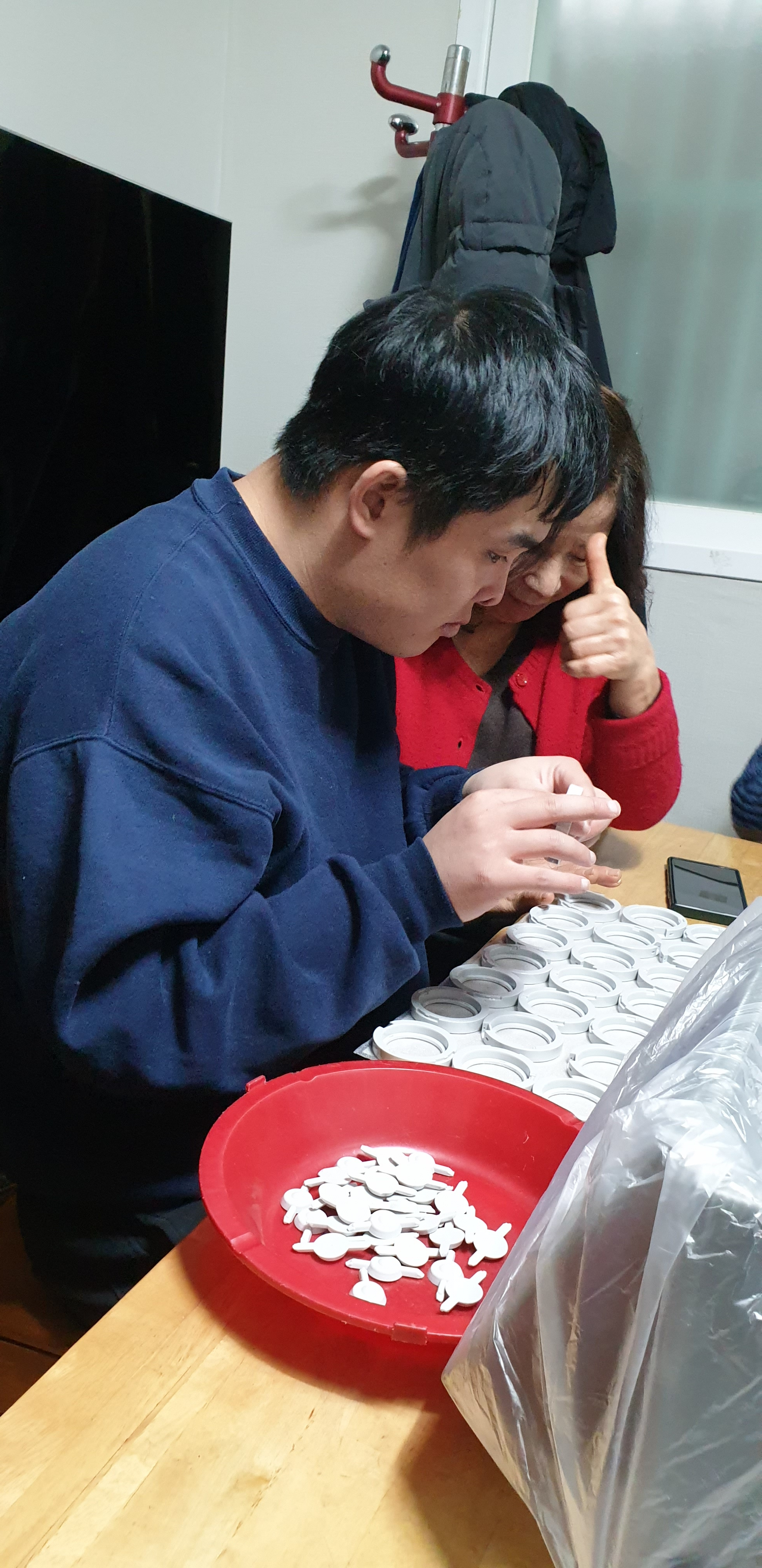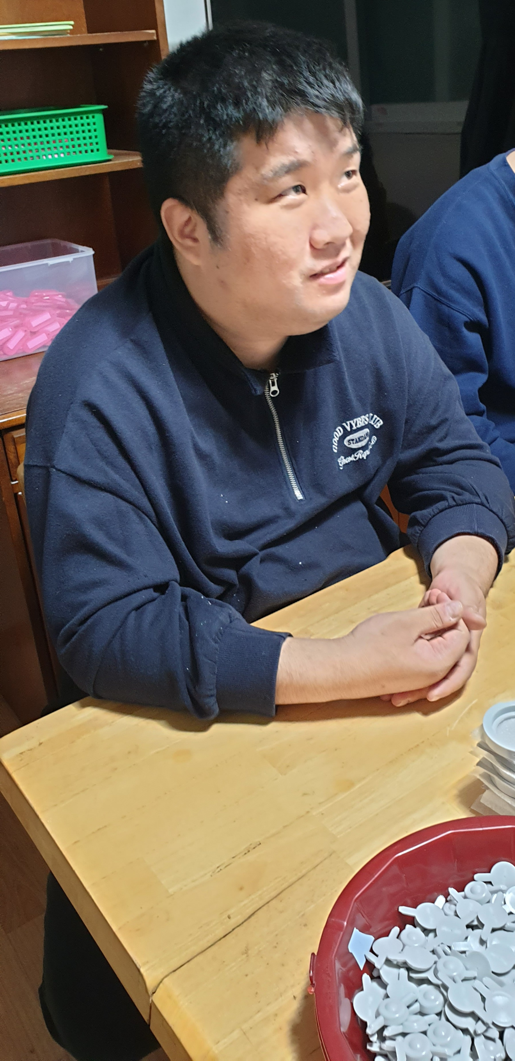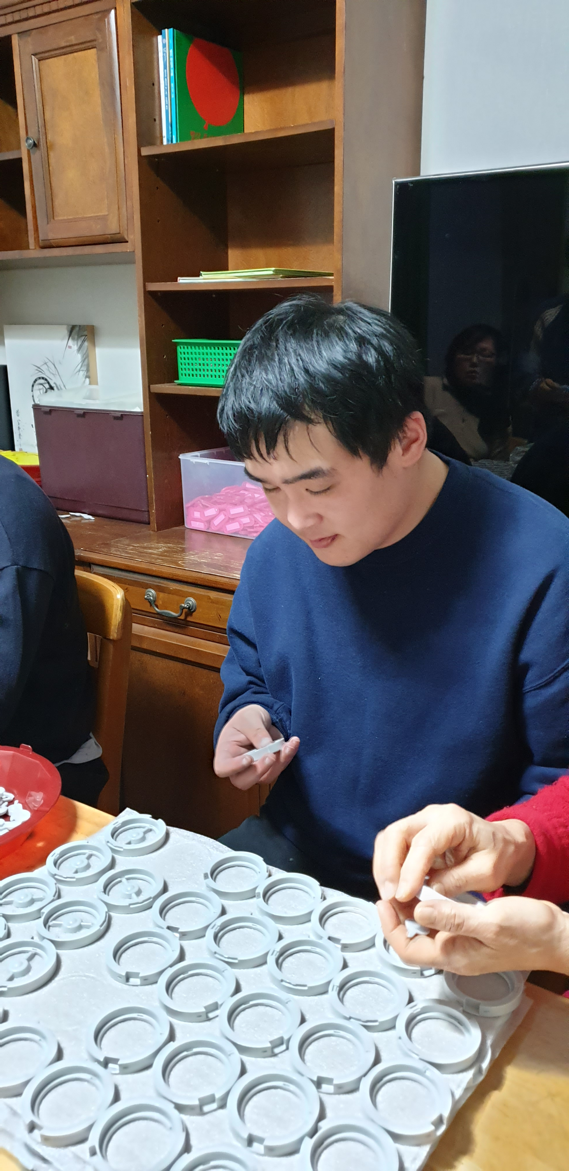 화장품 쿠션케이스를 만드는 부속품입니다. 지원자 선생님이 가르쳐주는 대로 작업을 잘 하십니다. ♡철님은 다른 이용자분들과도 거부감없이 기존 멤버와 한 팀과 같이 행동을 하십니다.