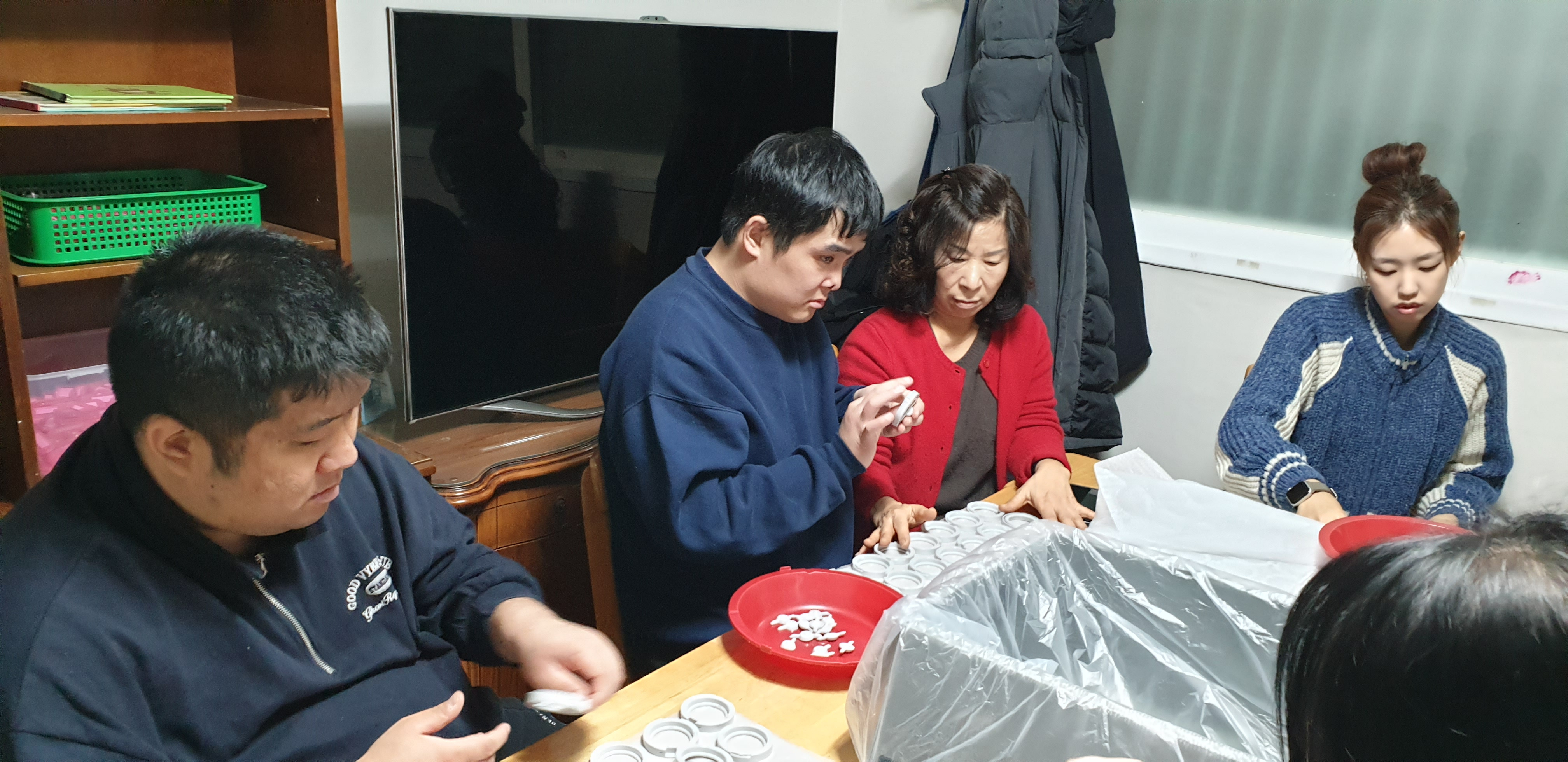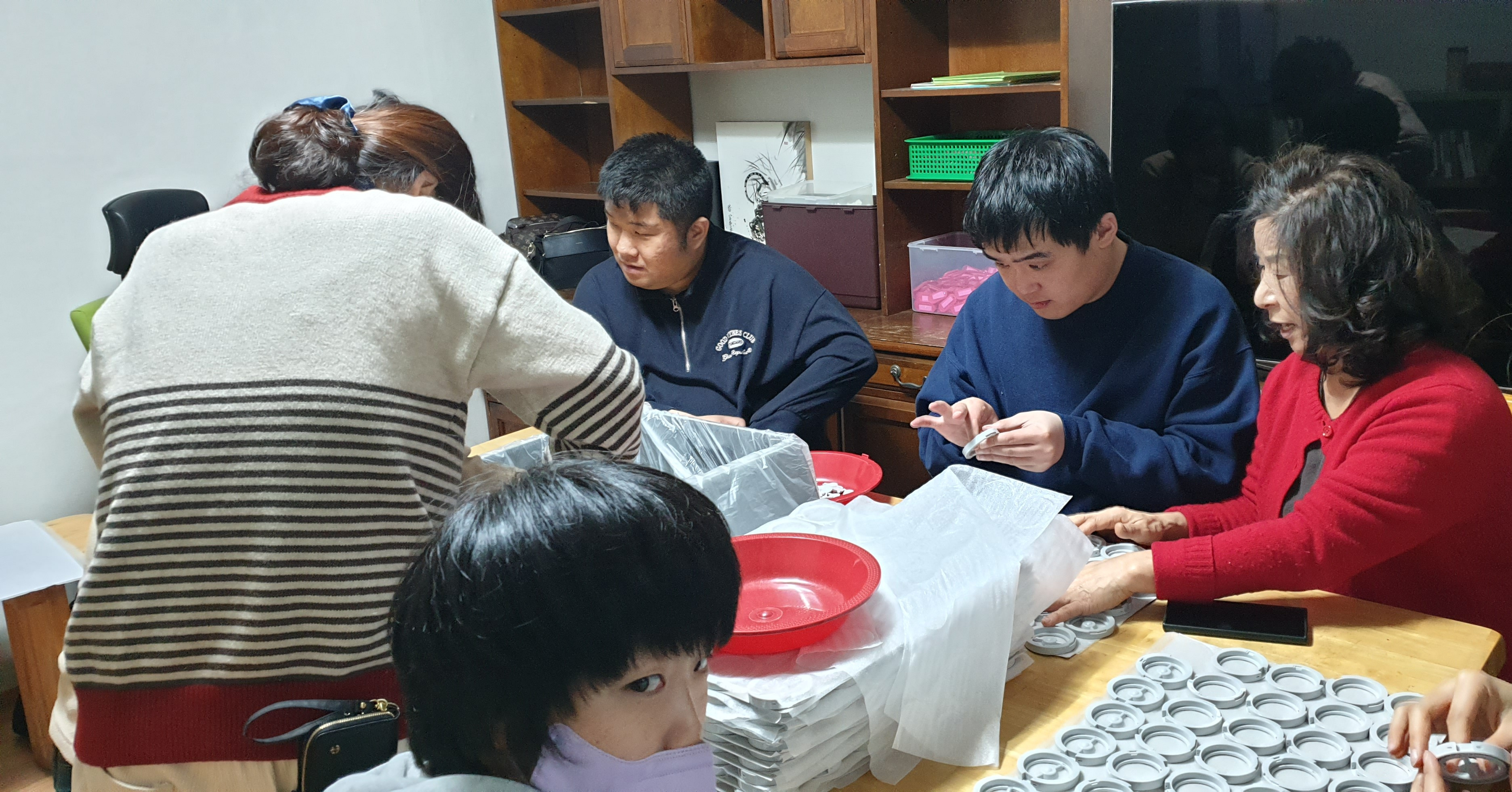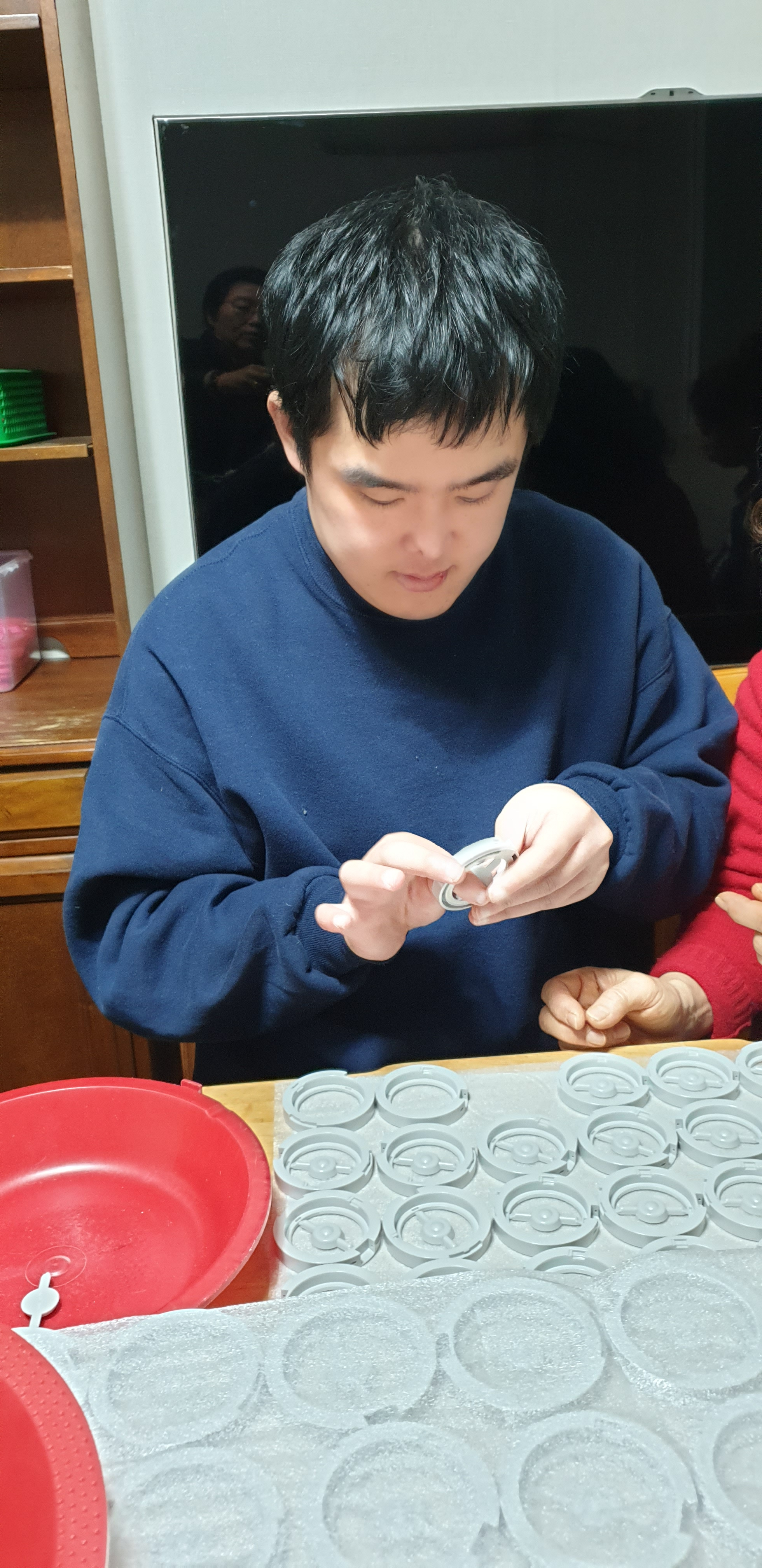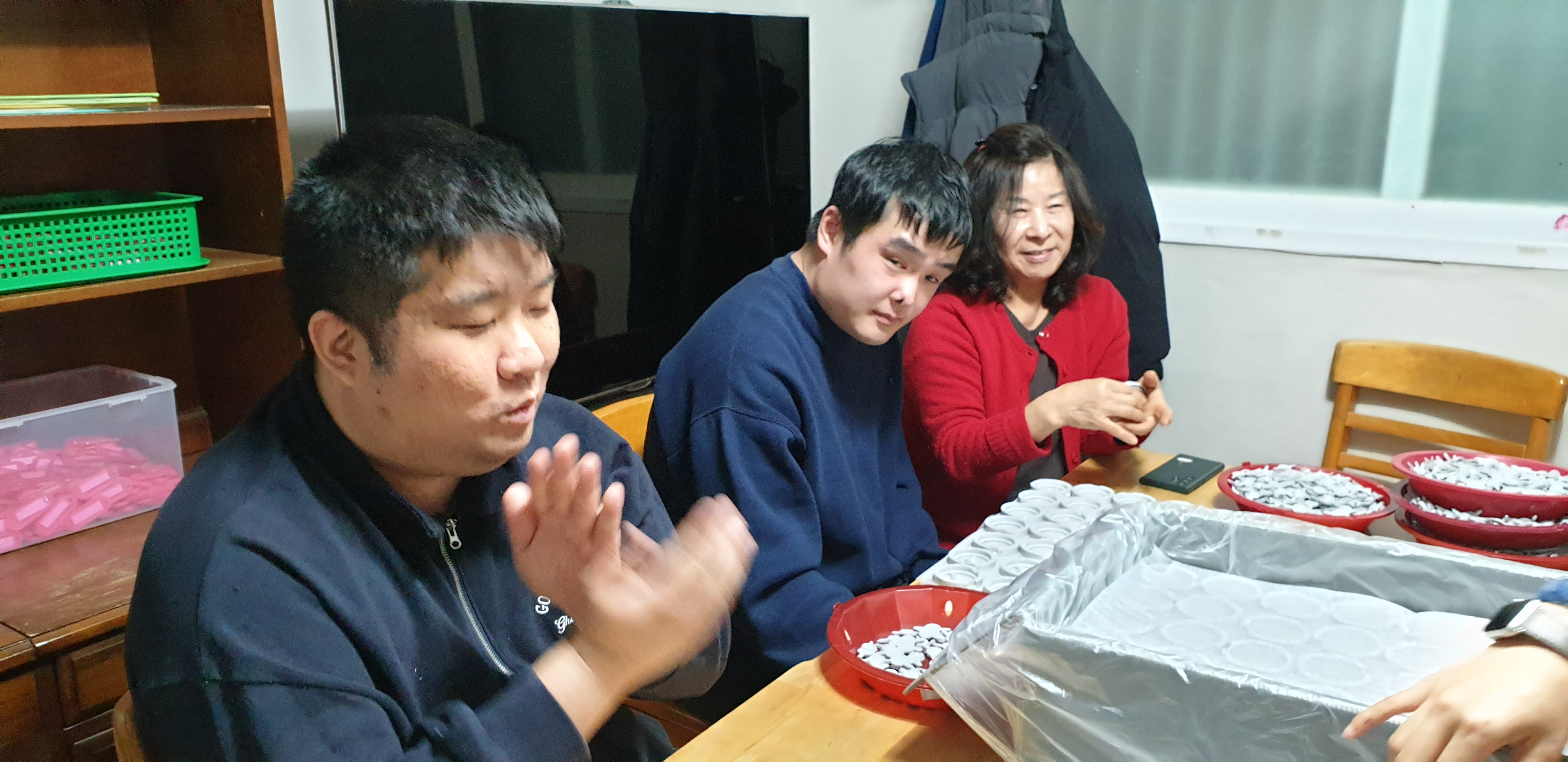 화장품 쿠션케이스를 만드는 부속품입니다. 지원자 선생님이 가르쳐주는 대로 작업을 잘 하십니다. ♡철님은 다른 이용자분들과도 거부감없이 기존 멤버와 한 팀과 같이 행동을 하십니다.