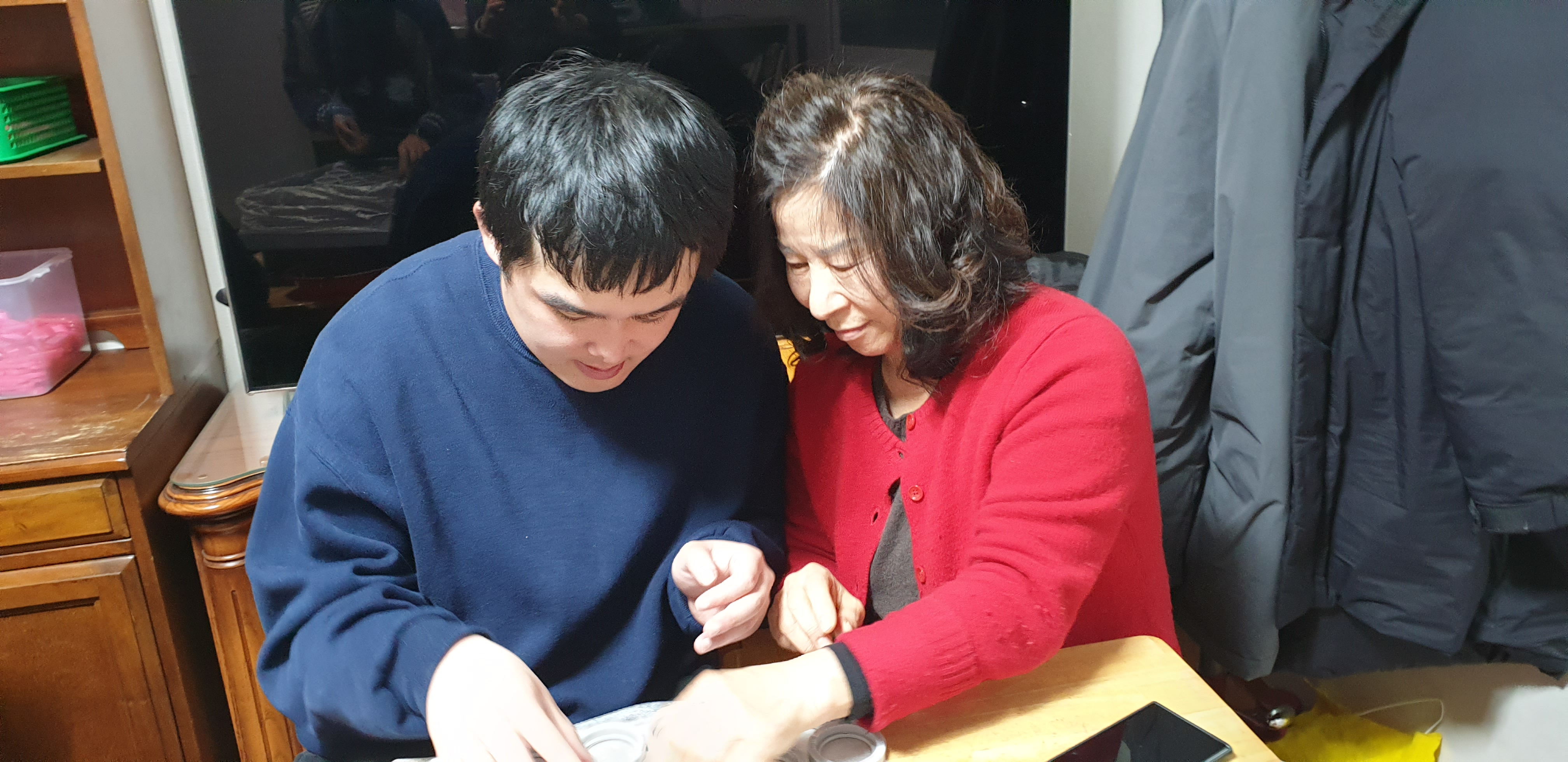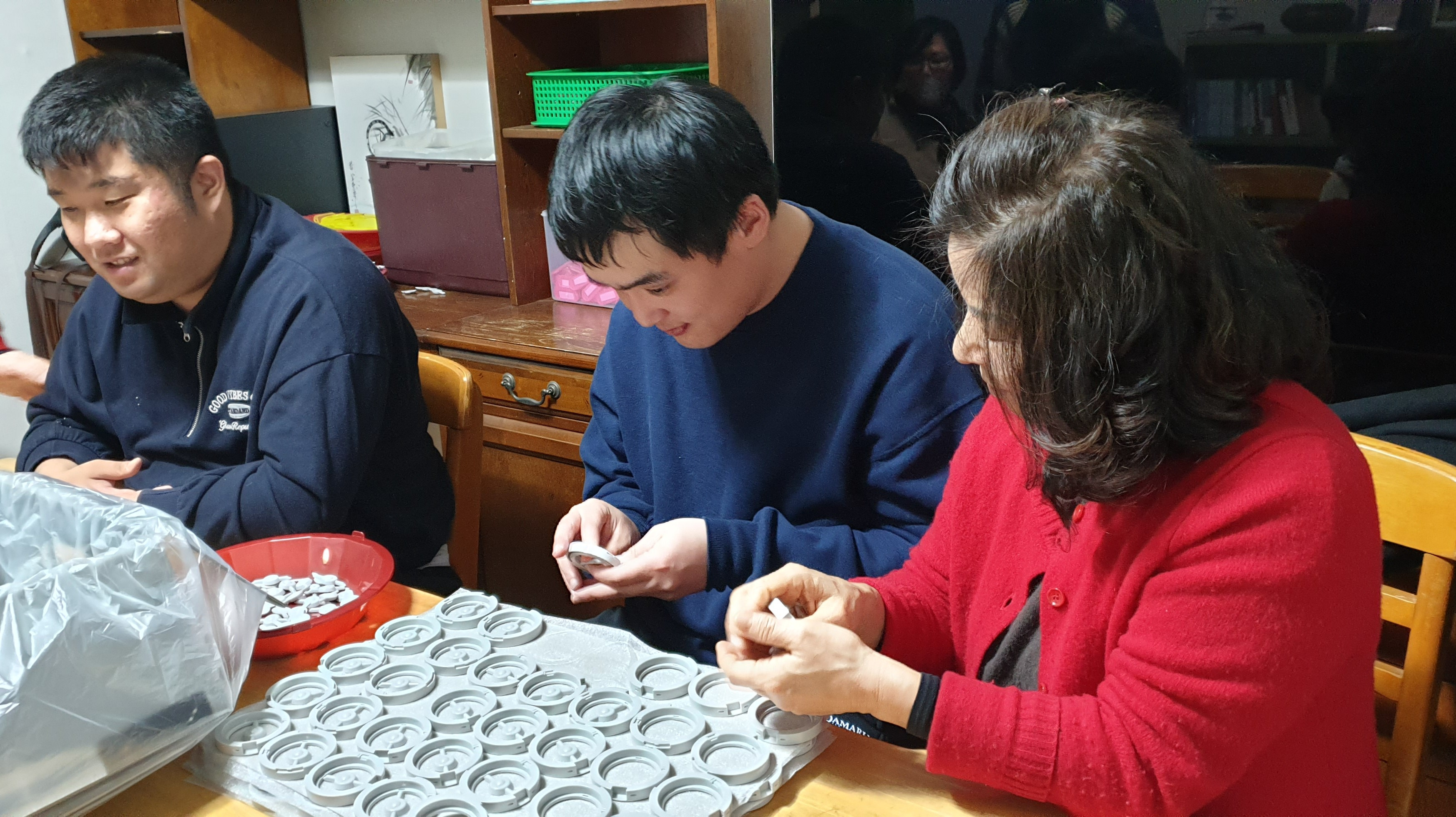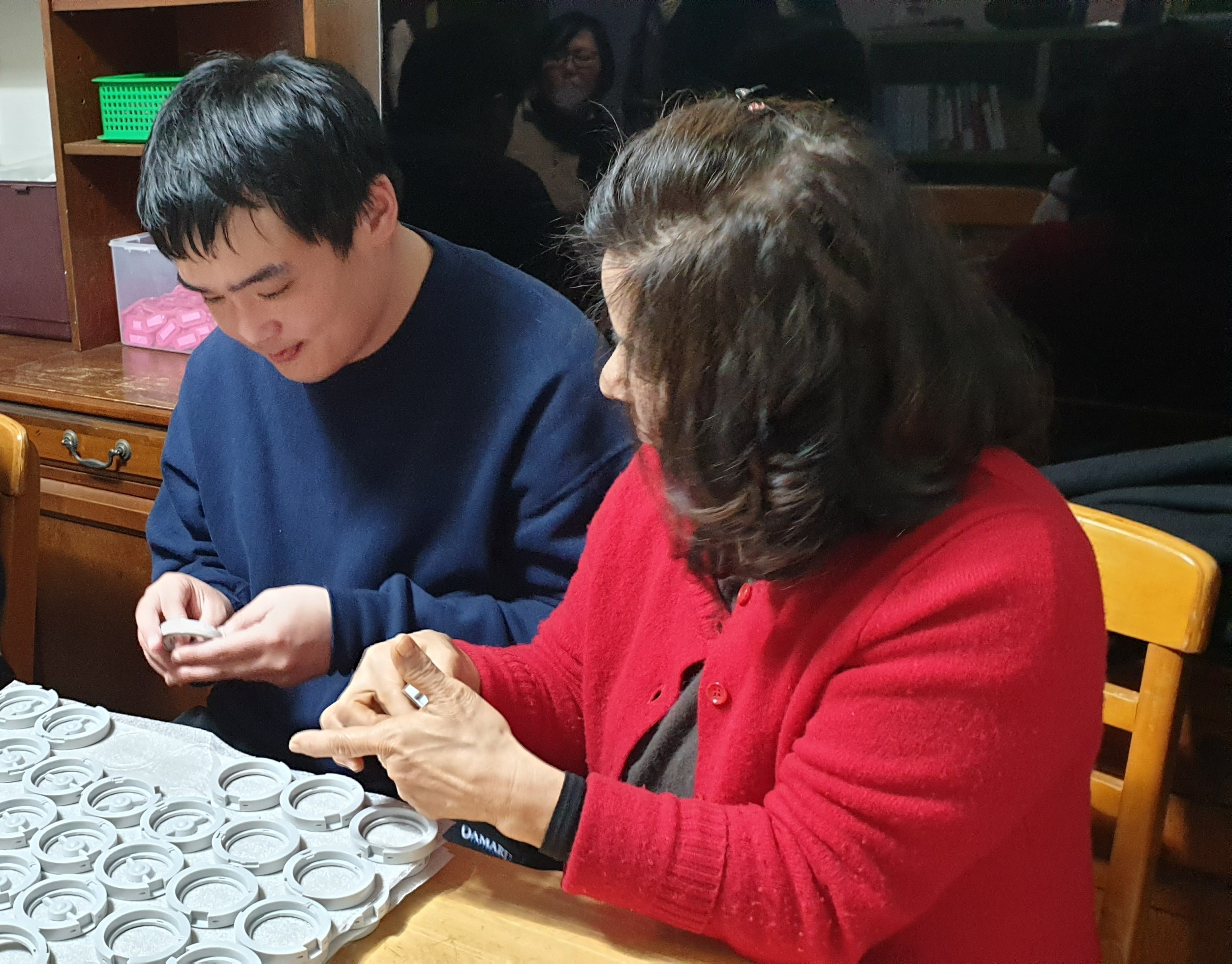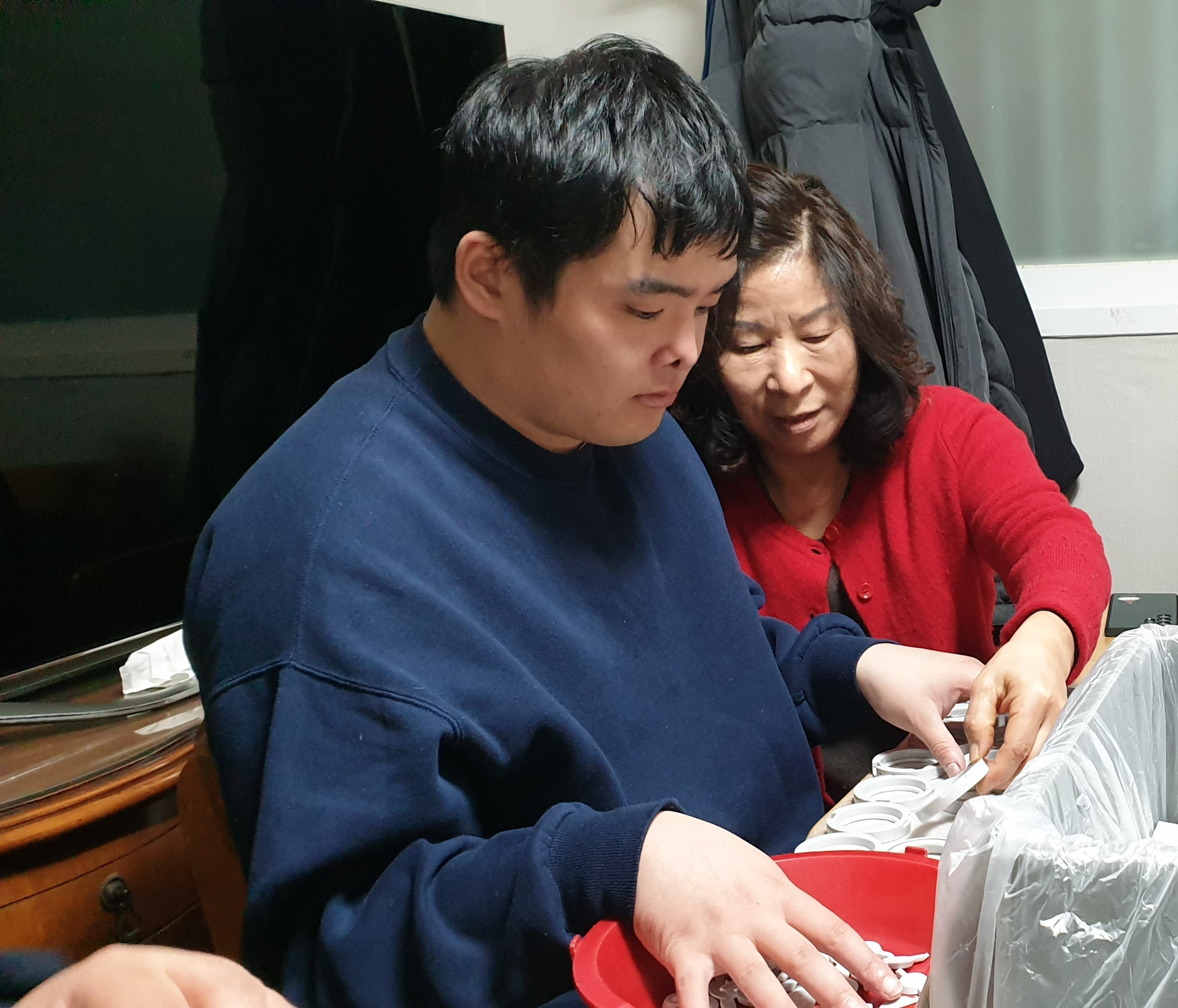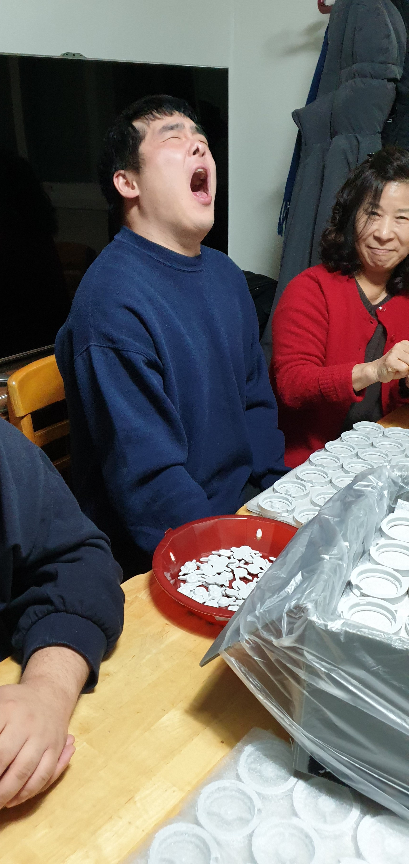 화장품 쿠션케이스를 만드는 부속품입니다. 지원자 선생님이 가르쳐주는 대로 작업을 잘 하십니다. ♡철님은 다른 이용자분들과도 거부감없이 기존 멤버와 한 팀과 같이 행동을 하십니다.
