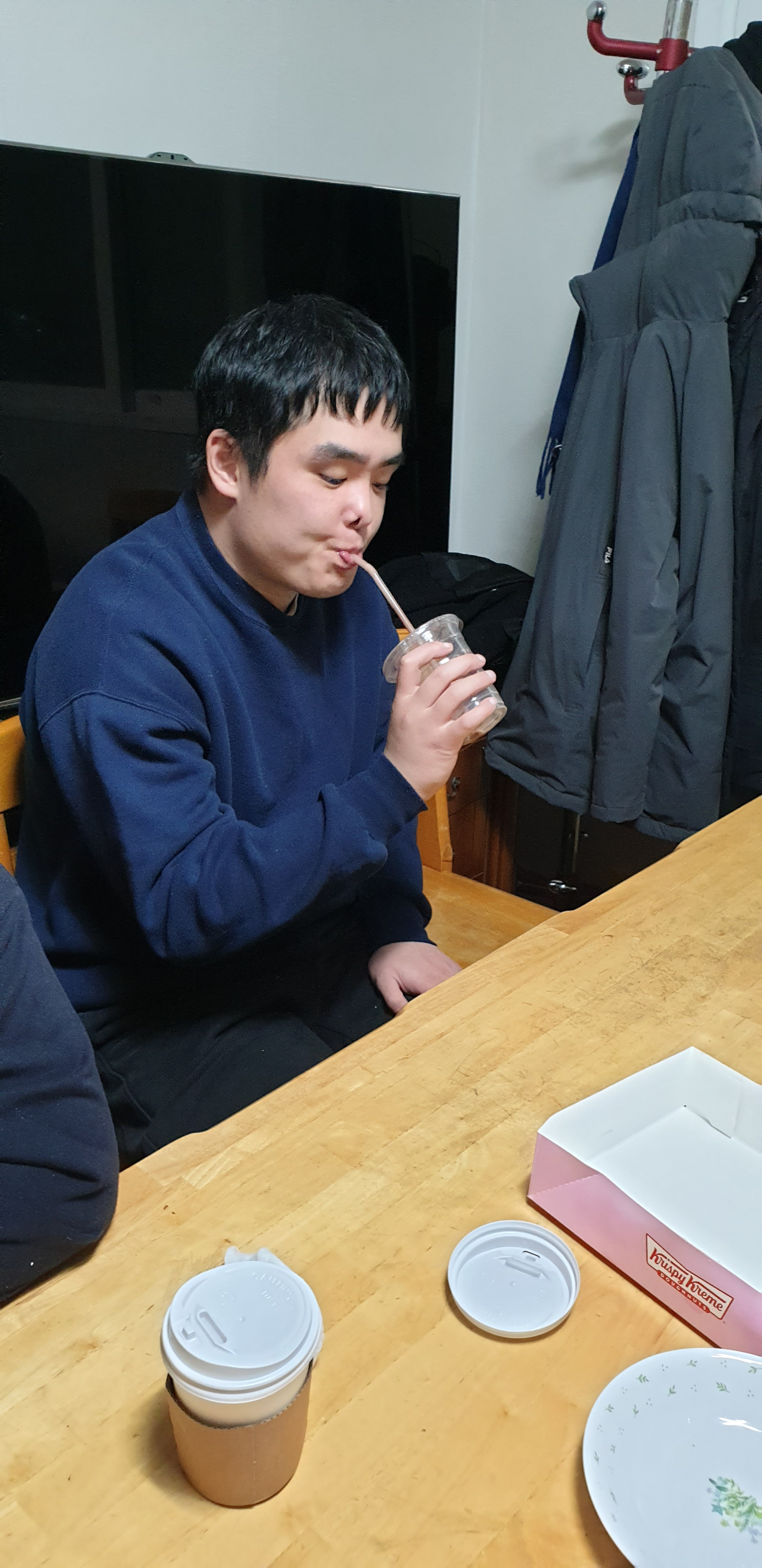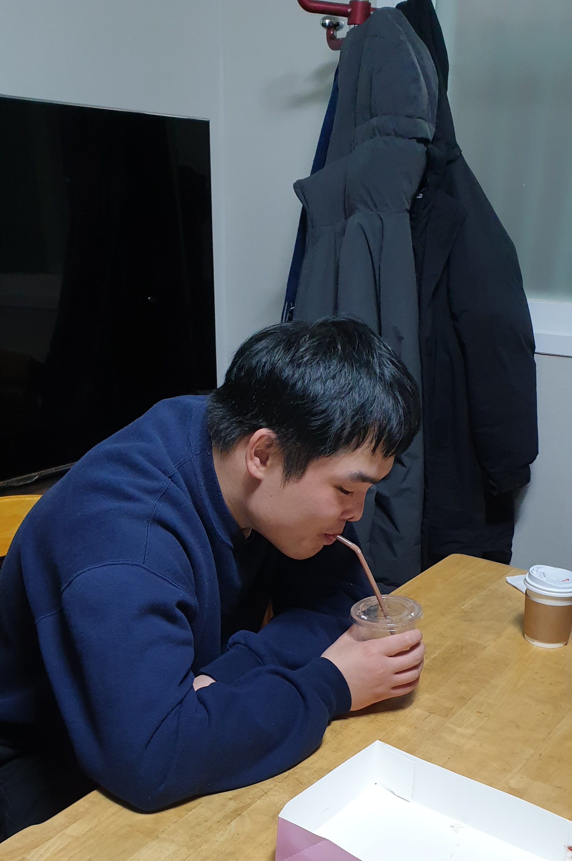핫초코라떼를 ~~~〉 아이스초코라떼로 급조하여 이용자의 입맛을 챙겨주시는 센터장님 센스장이 !!! 철님의 음료 순삭 시간 포착~~