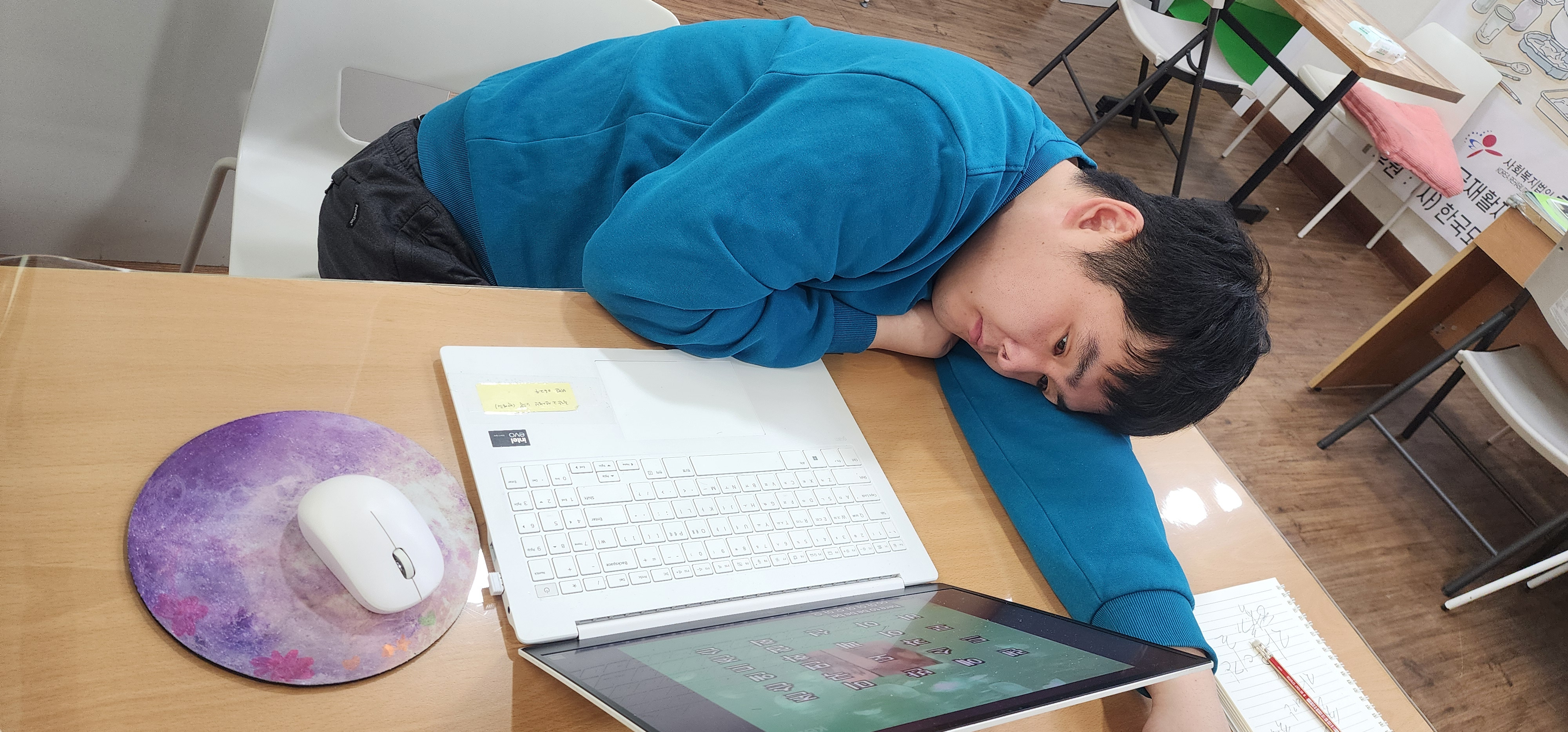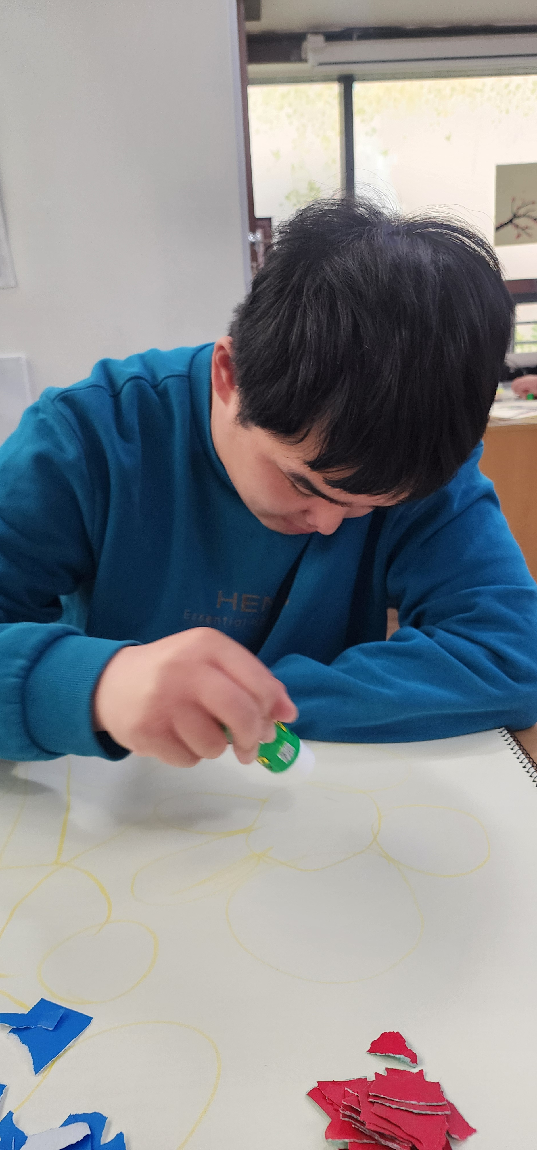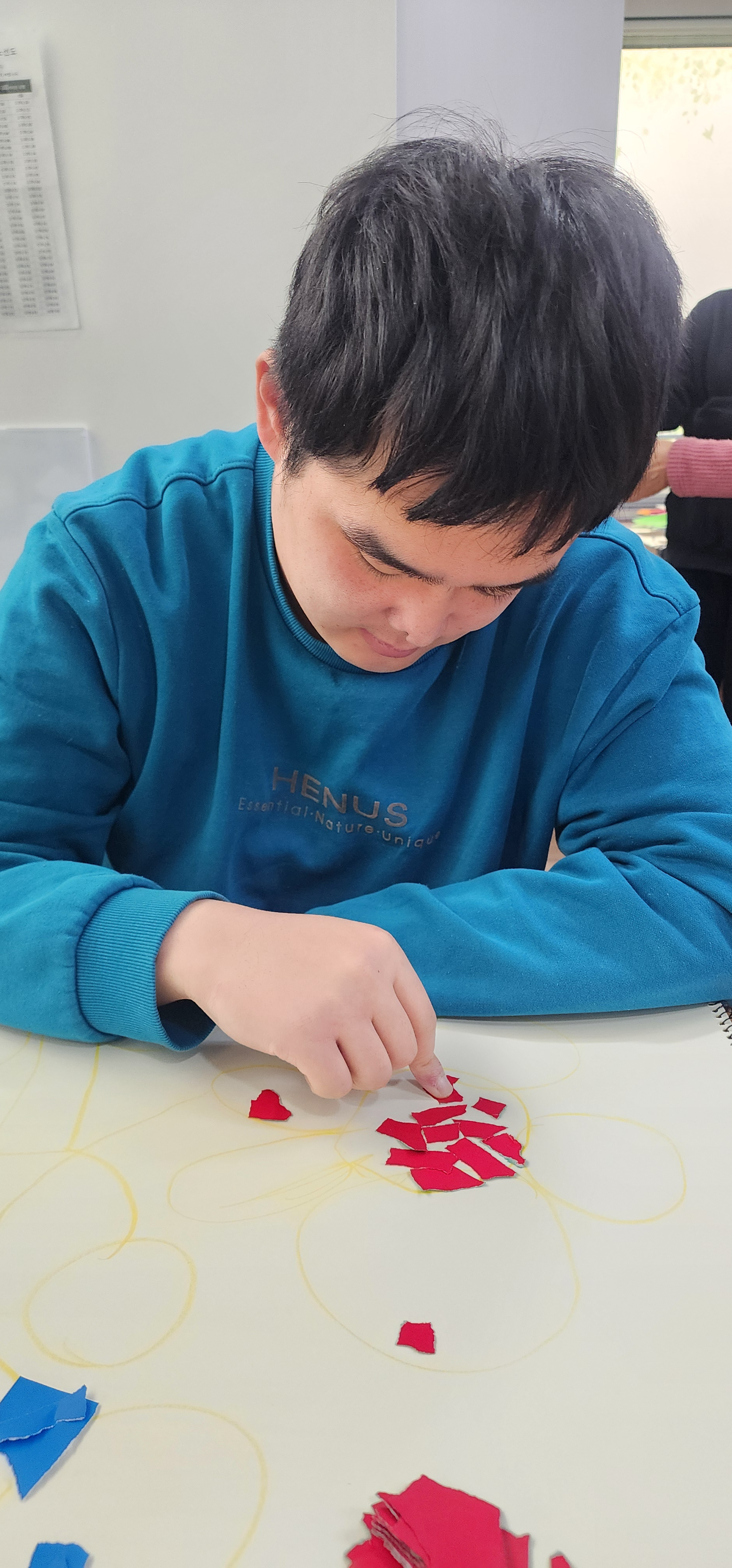 노트북 활동 후에는 미술활동(그리기 + 색종이 찢어 붙이기)에 참여하며 표현 활동을 경험했습니다. 점심은 거부 의사가 있어 무리하지 않고, 물과 간식 섭취를 지원한 뒤 양치 및 화장실 이용을 안내했습니다.