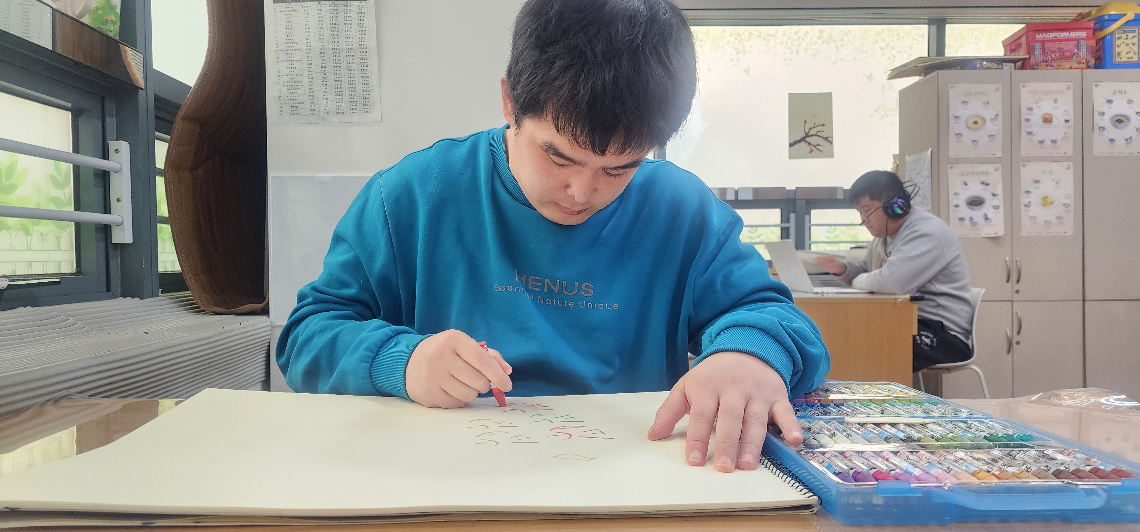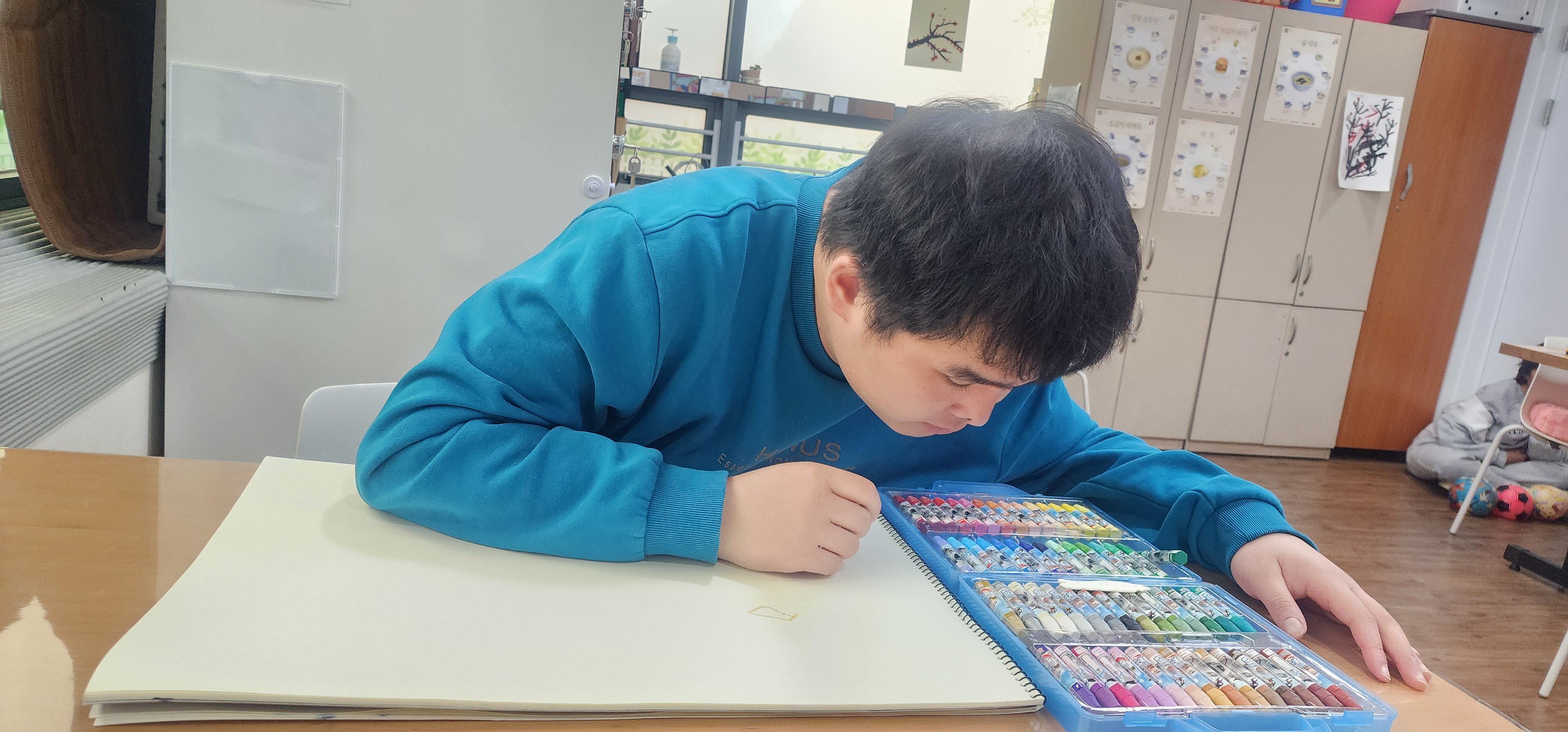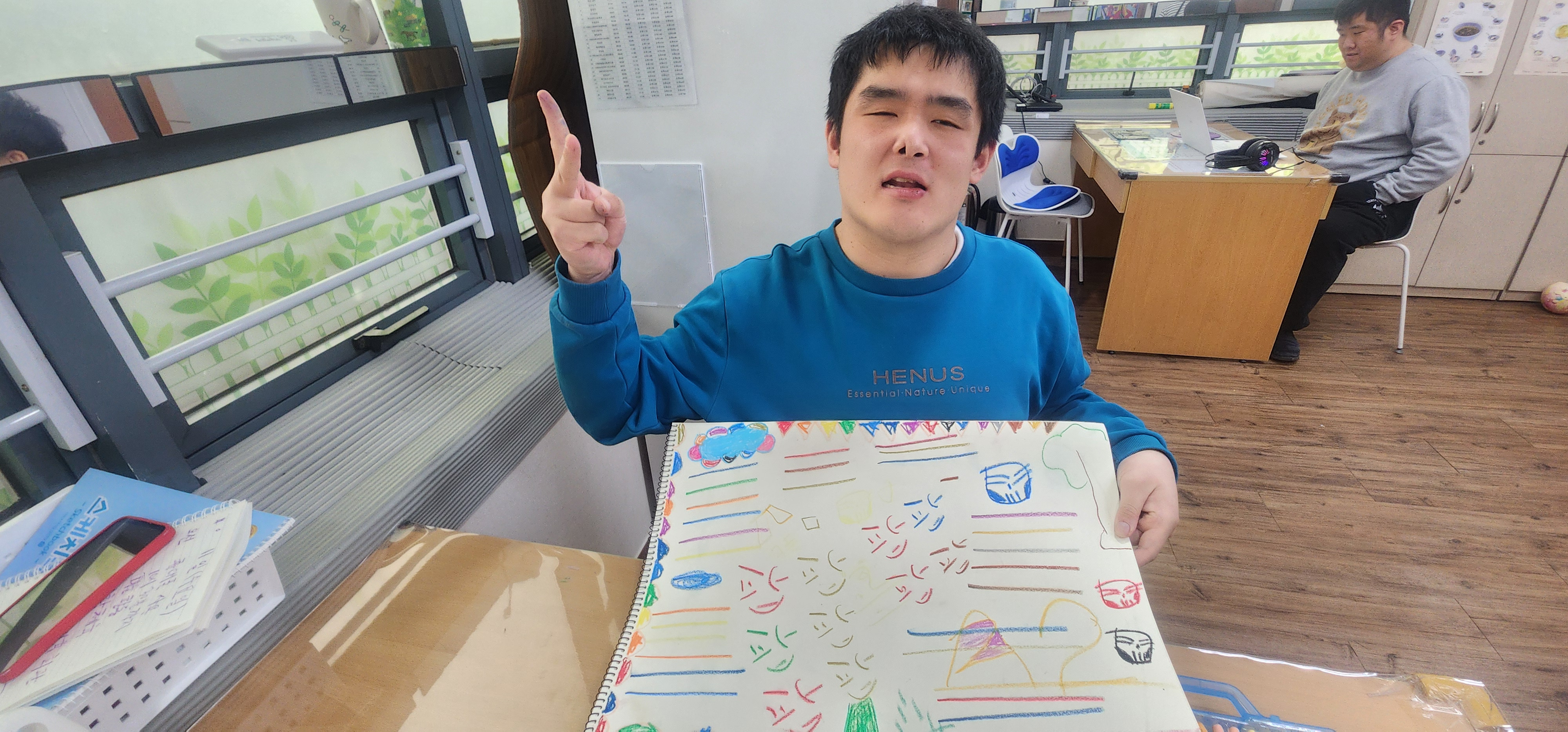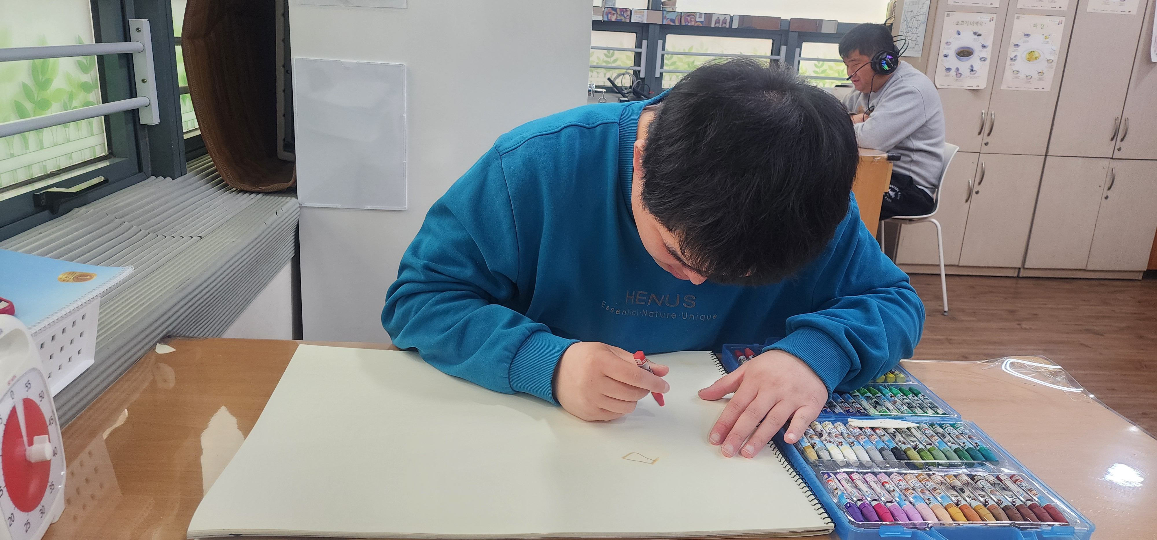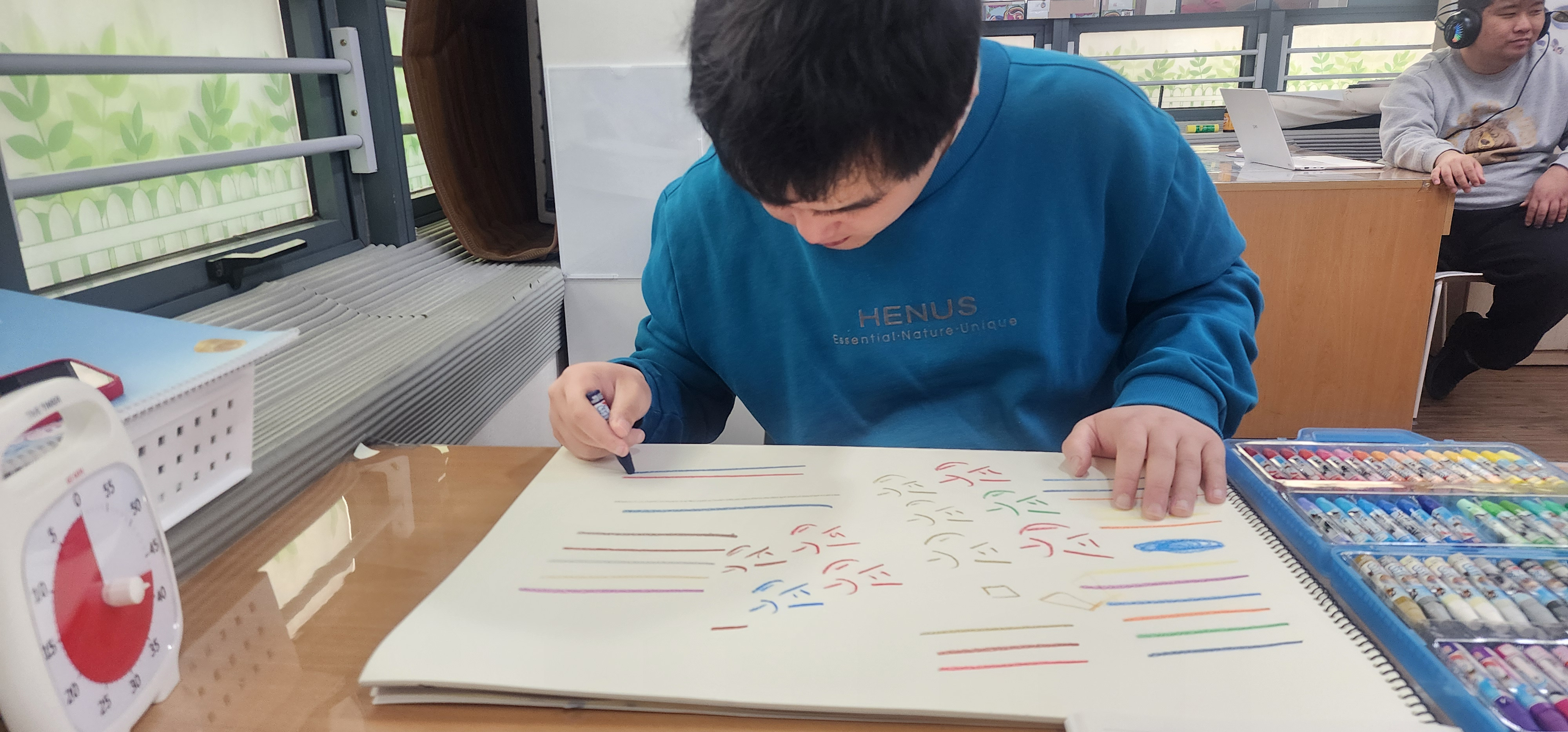 활동 전후로 휴대폰 사용, 볼륨 조절, 착석 등을 언어적 안내로 반복 지원하였고, 일정 문장을 제시했을 때는 문장을 응시하며 잠시 안정되는 모습도 보였습니다. 이후 미술활동에서는 크레파스 색을 고르고 선긋기/도형 따라 그리기에 참여했고, 완전한 채색은 어려웠지만 부분적으로 색칠하며 집중하는 모습이 관찰되었습니다.
