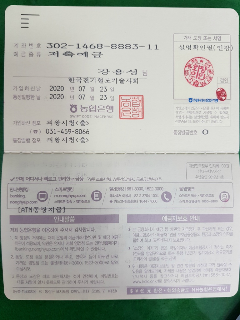 - 계좌명의 : 강용성(한국전기철도기술사회)
