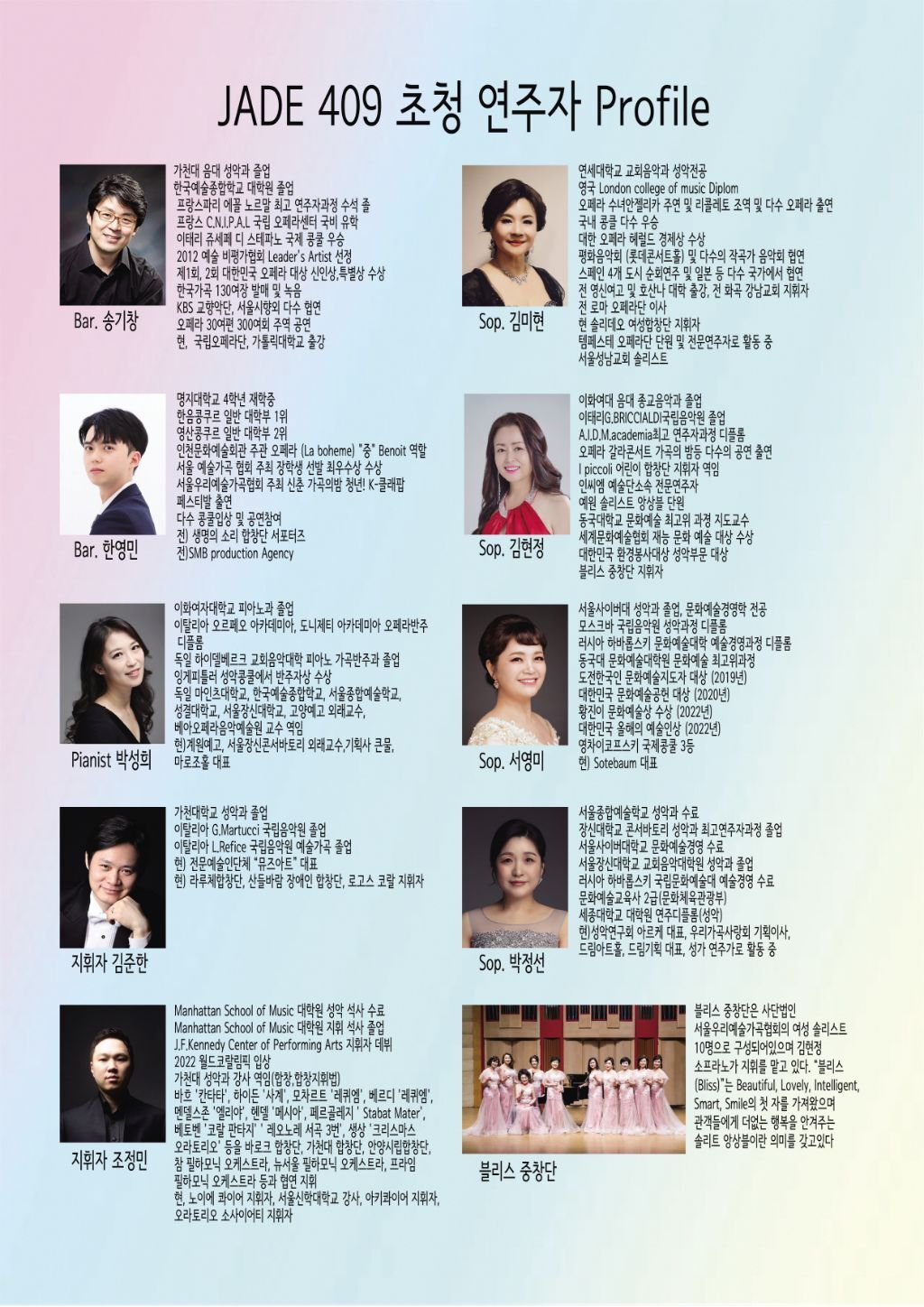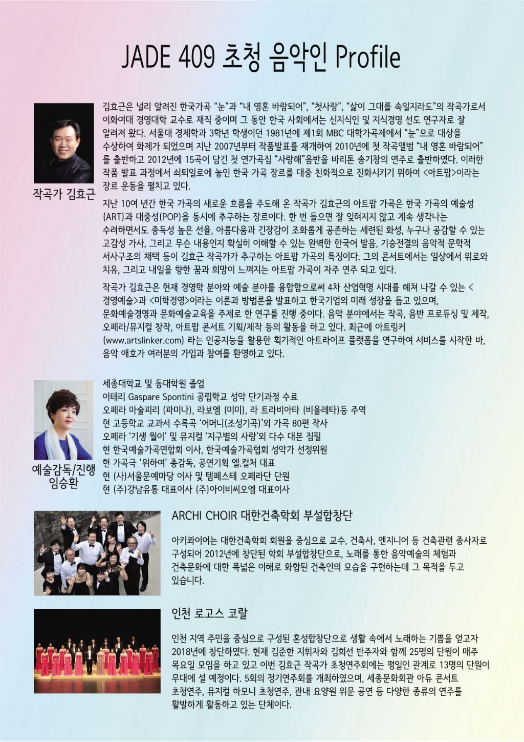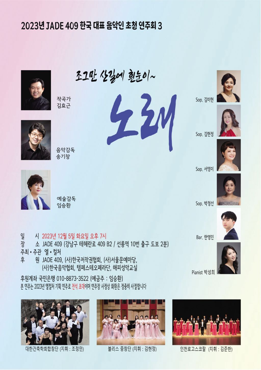 “JADE 409 한국대표음악인 초청연주회 3”으로 진행되는 ‘눈’의 작곡가 김효근 교수님 초청연주회 안내입니다.