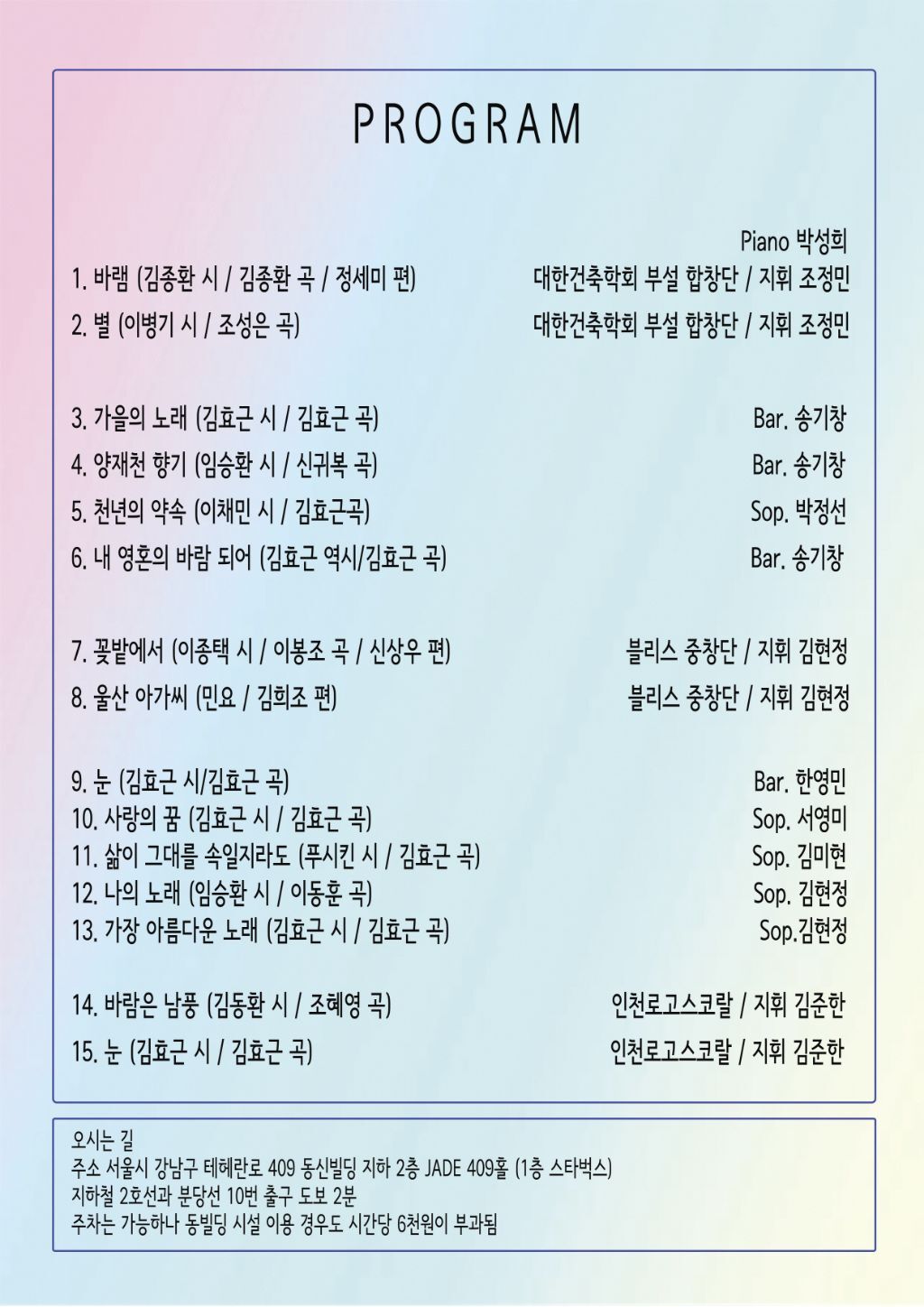 합창이 끝난 후 객석에 계신 분들 모두 ‘눈’을 합창할 계획이오니 이 계절을 느끼시며 다함께 부르기 ‘눈’에 참여하시지 않으려는지요.